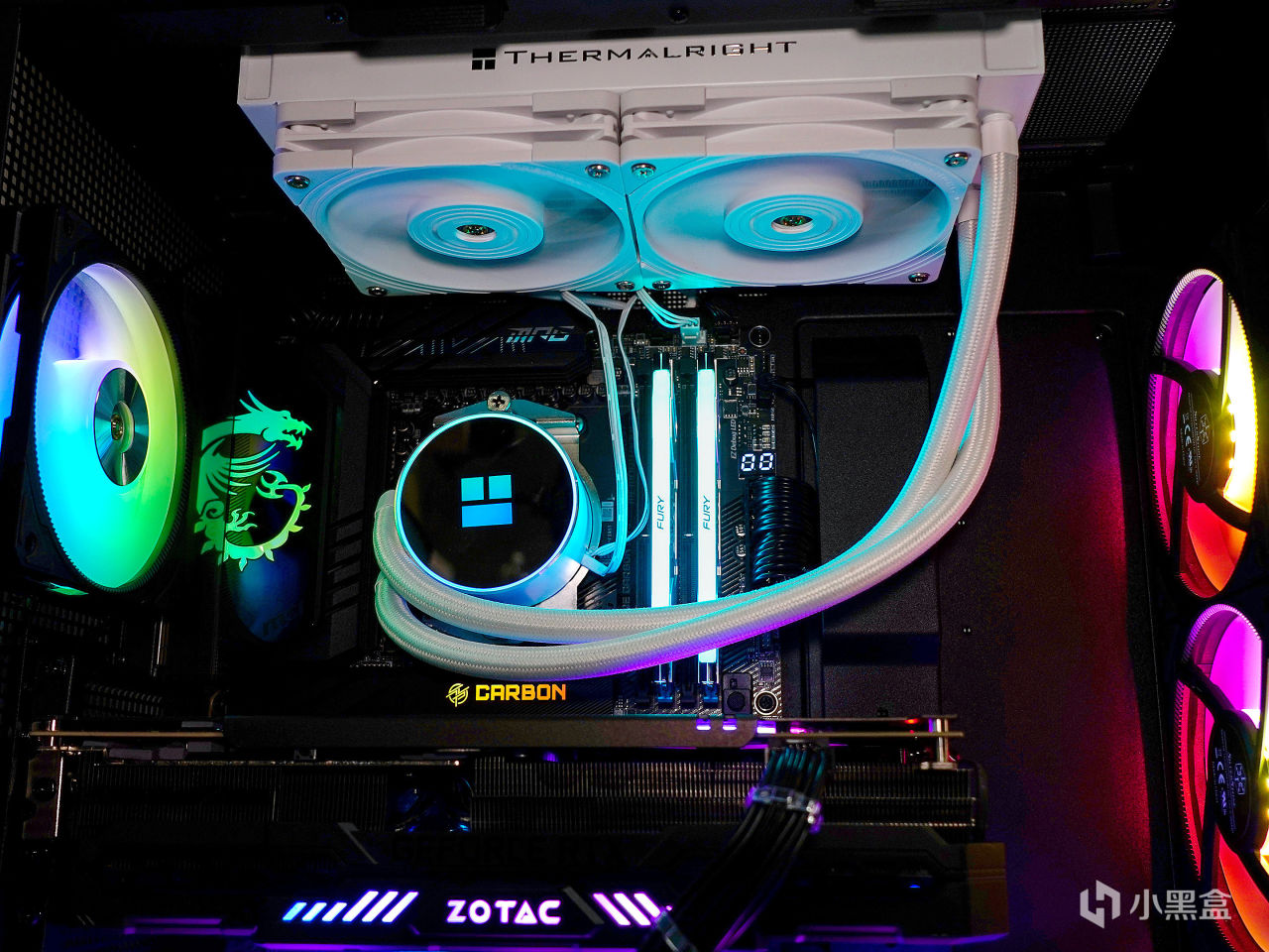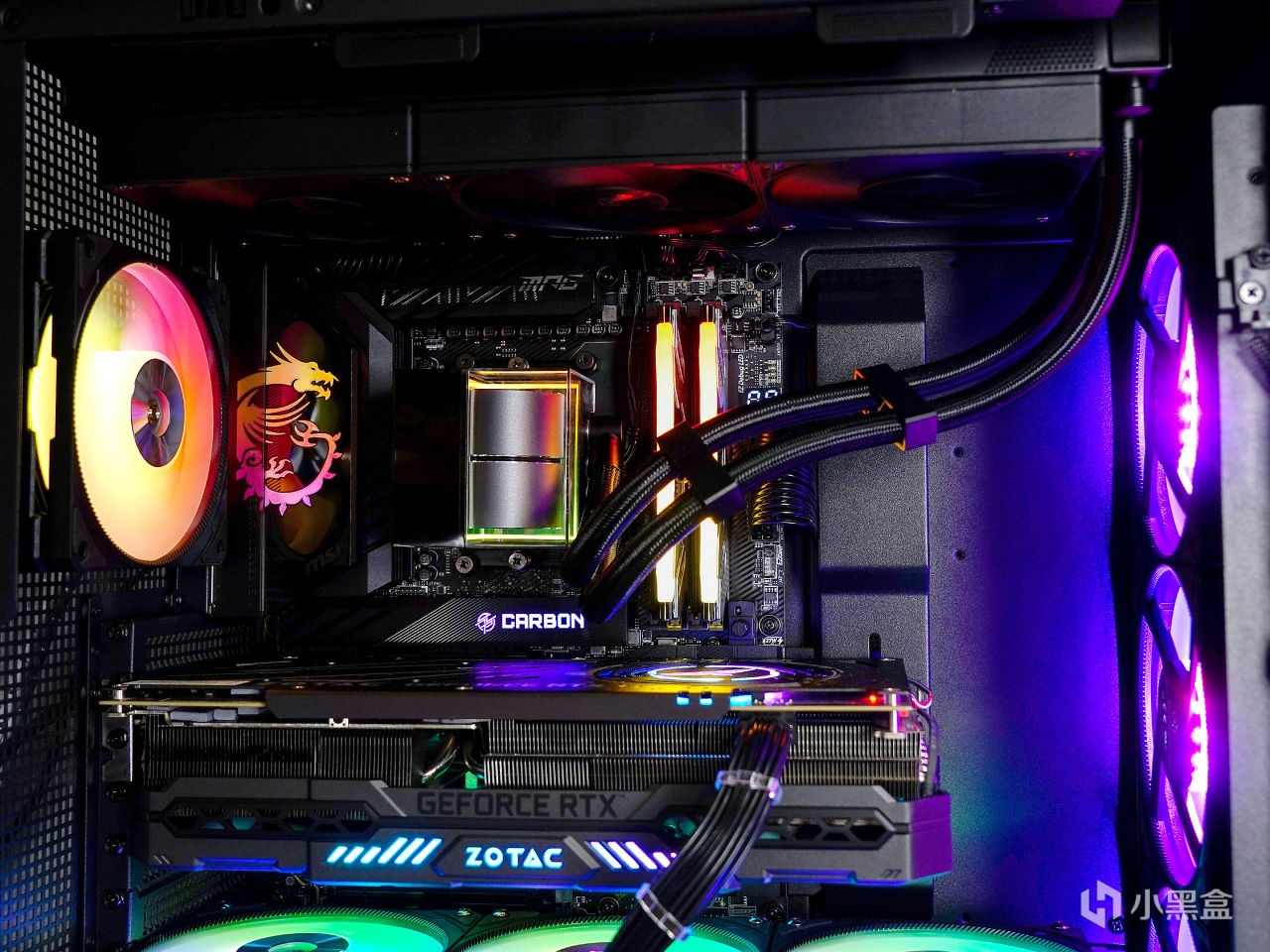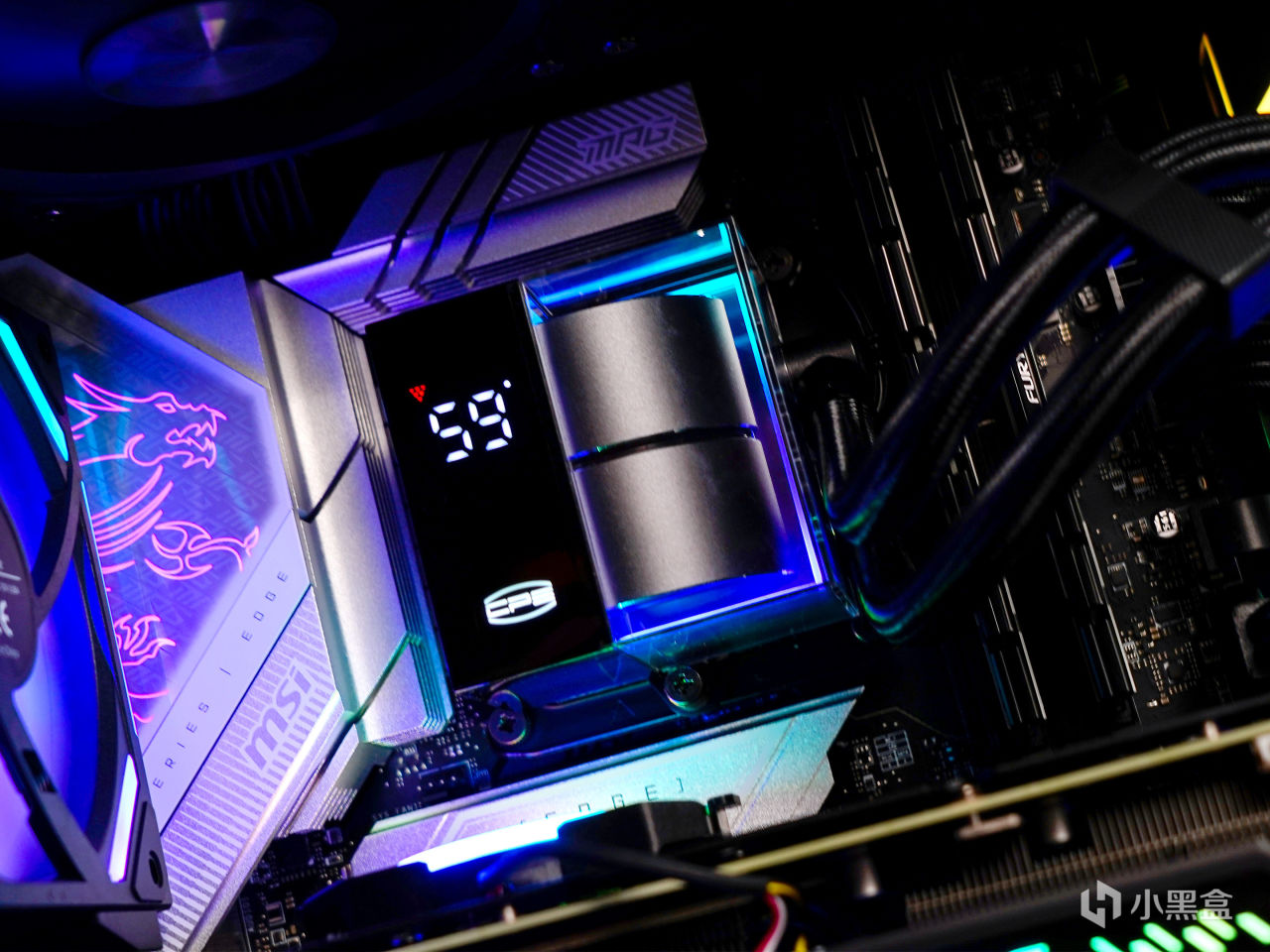 ▼装机效果如下,冷头一部分是透明亚克力壳,内部周边有ARGB灯带;风扇主打性能,无光效,在水冷组中,其风扇转速,风量和风压都是最强的。