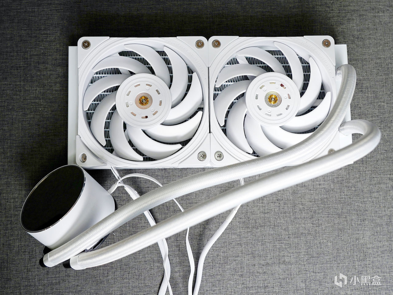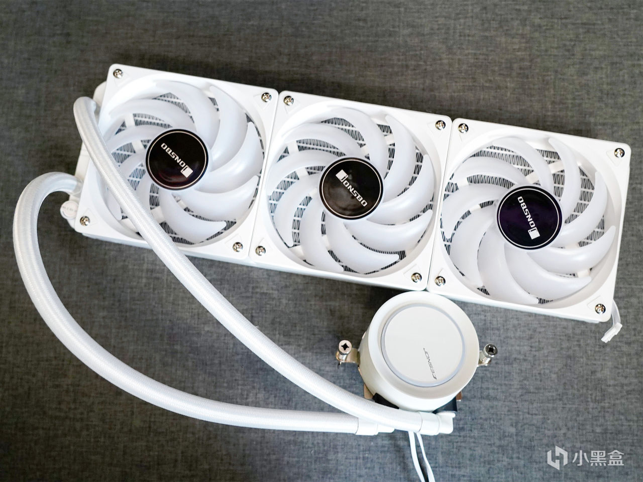 ▼风扇和冷头都有灯效,装机后的效果很漂亮。自带的风扇型号为Q120汉堡扇,厚度为280mm,是水冷组中唯一采用厚风扇的。