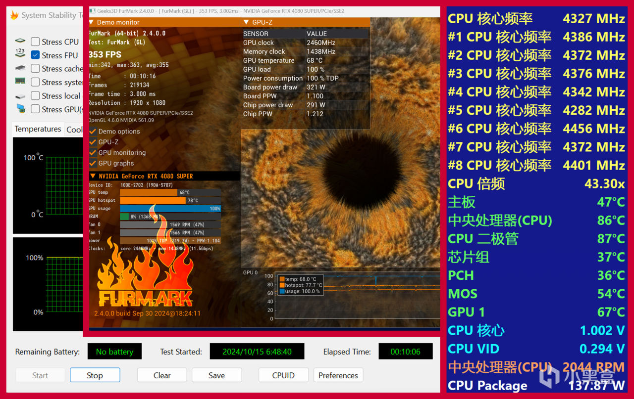 ▼最后来进行一个变态的AIDA64单烤Stress FPU+FURmark测试。据我所知还没有单一应用可以让CPU和GPU同时满载!显卡为4080s,使用FurMark烤机后达到320w的功耗,使机箱内部的温度整体提高,是模拟机箱散热条件不佳,或使用环境温度特别高的情况。