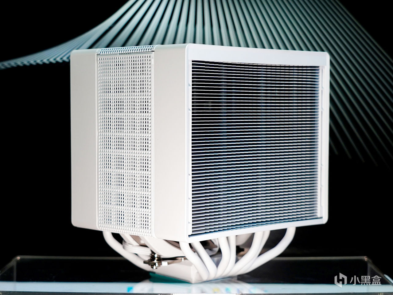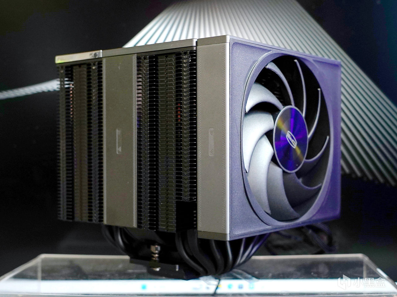 ▼这款散热器的体积和热管规模最大,风扇性能最强。顶盖部分一角采用高光镀镍工艺的金属框,里面是有块发光板,支持ARGB彩光同步。