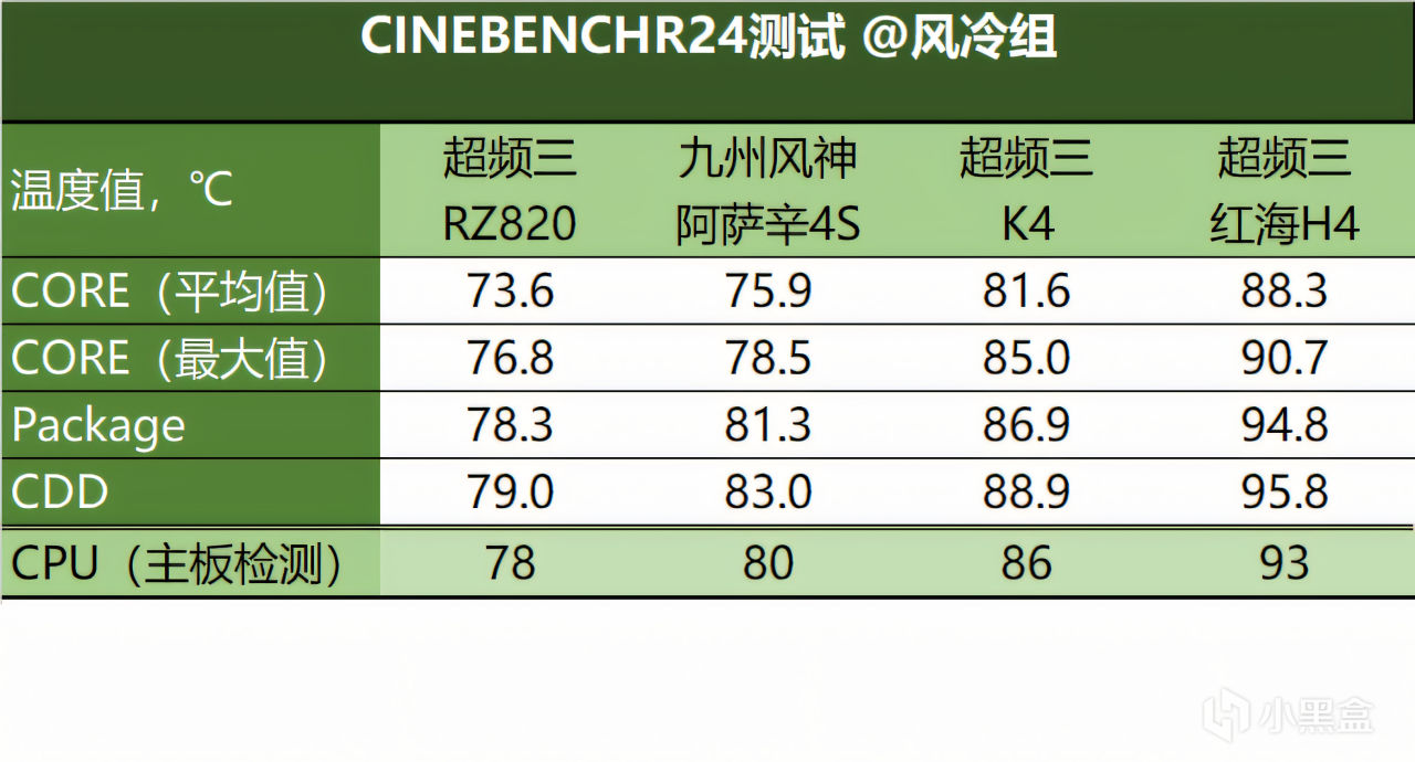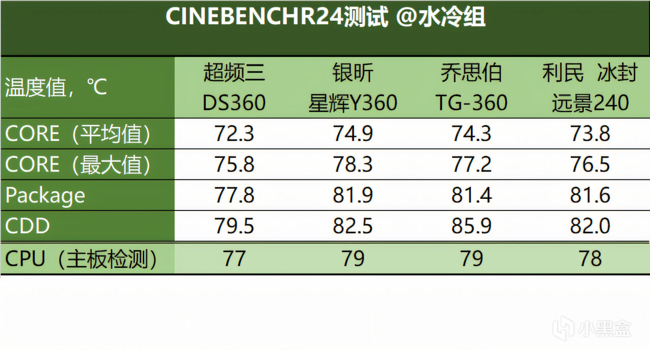▼在CineBench R24测试中,水冷组的4款产品完全没有拉开差距,仅仅只有1~2℃左右的差距。