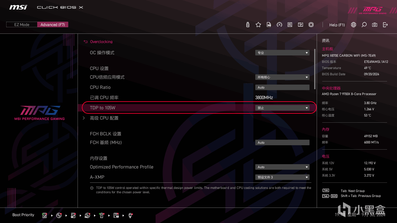 ▼65w默认状态9700X(实测88w)的使用温度和功耗都很低,但多核性能没有完全释放。开启PBO或者解锁105w选项,可以提高10%以上的多核性能。但使用PBO时CPU温度偏高,而105W TDP下的CPU温度更低,性能方面也只是略低PBO一点,所以最终决定使用105W TDP模式进行散热器测试,这样也让一些入门级散热器有了上场的机会。