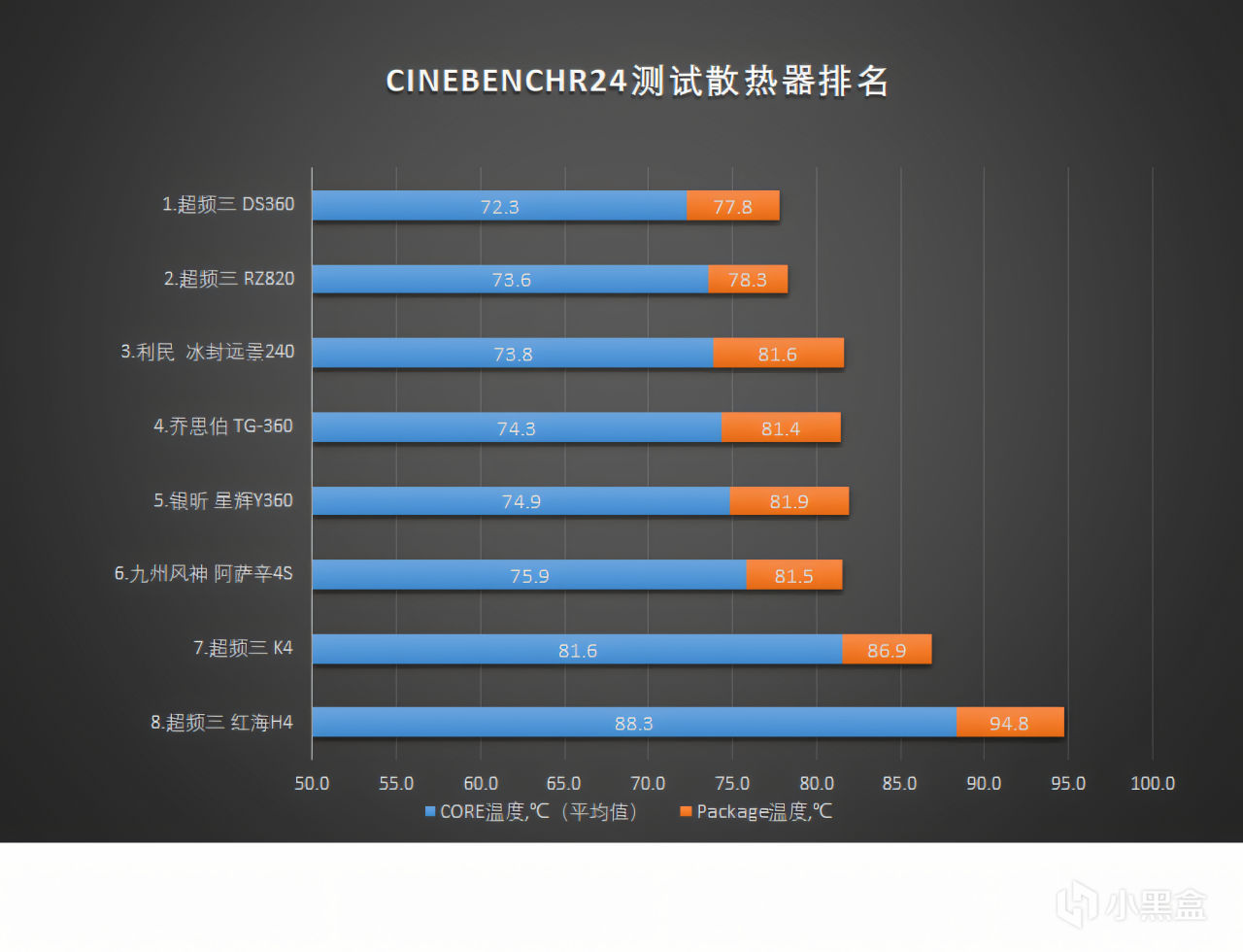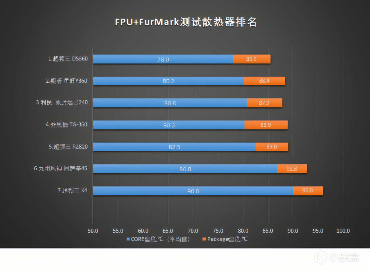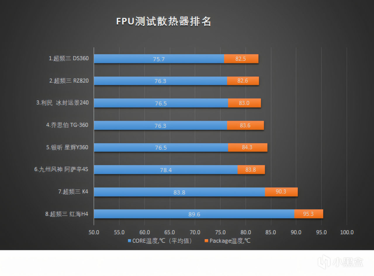 对8款散热器进行排名,取内部CORE平均温度和表面packagae温度的平均值作为排名依据,温度越低名次越靠前:
