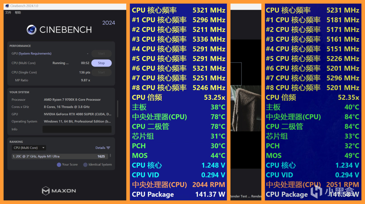 ▼测试内容包括运行CineBench R24测试,AIDA64单烤Stress FPU,AIDA64单烤Stress FPU+FurMarks三种情况下时的温度表现(都是10分钟测试时间)。使用CPUID HWMonitor,清除前3~5分钟测试数据,记录稳定后的CPU内外温度数据。