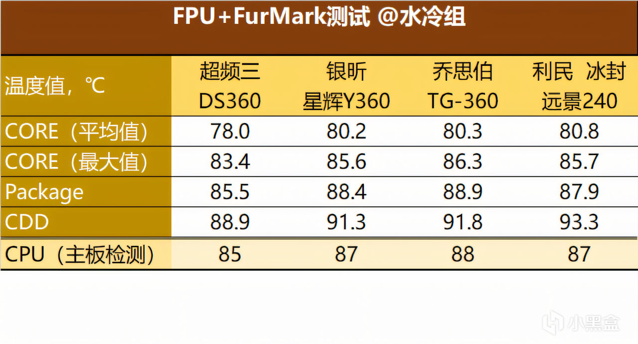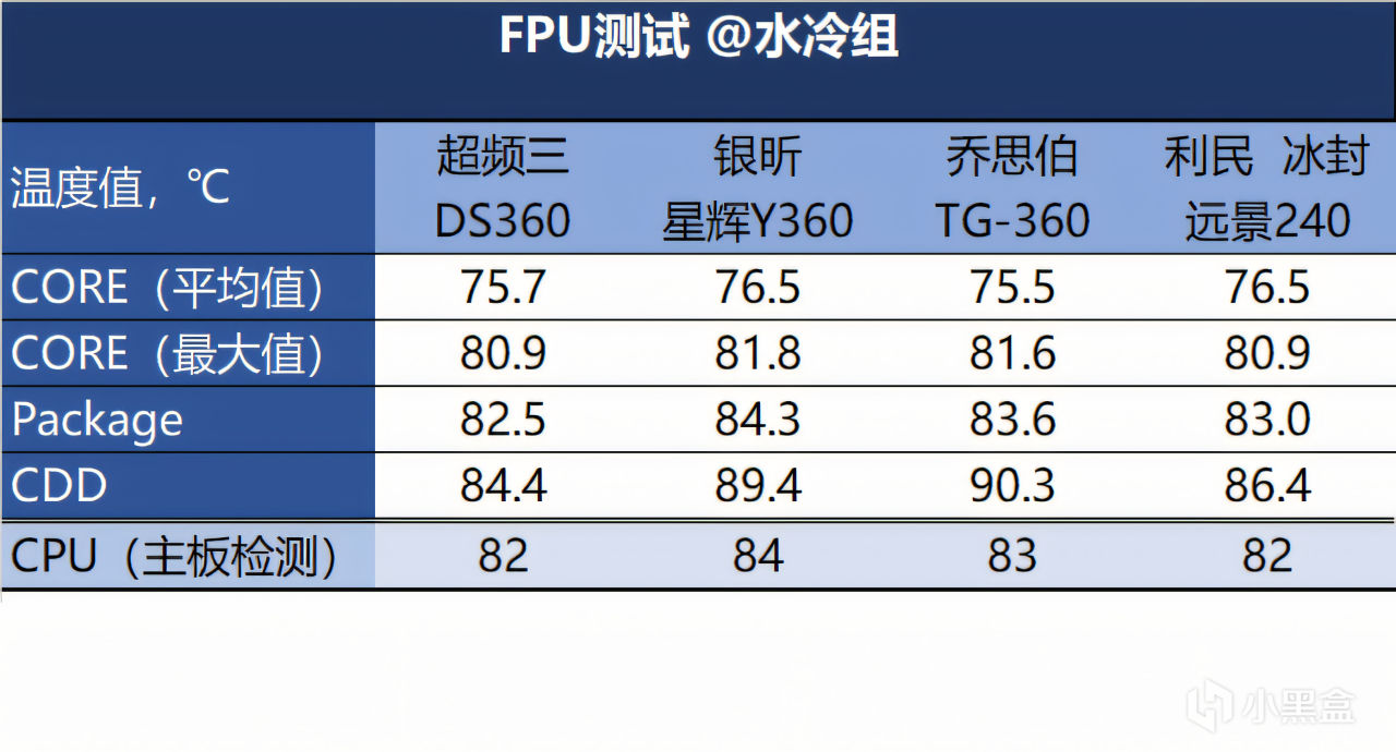 ▼在FPU测试中,水冷组的温度都有提高,但还是没有拉开差距,差异还是在1~2℃左右。