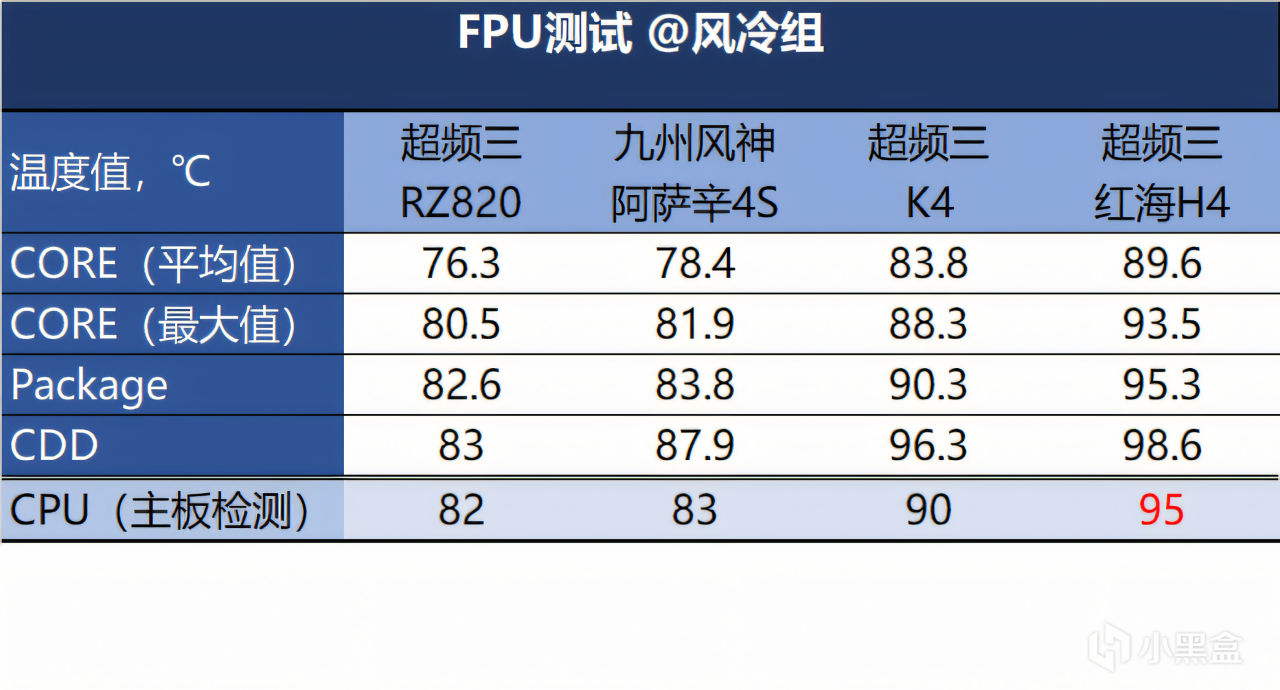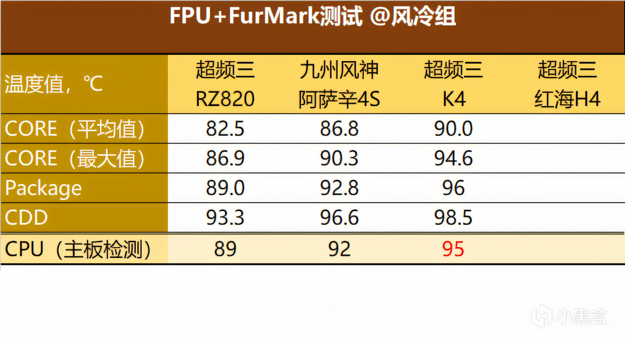 ▼风冷组这边,红海H4在双烤机测试达到了温度墙,所以没有它的成绩。两款双塔散热器成绩与单塔散热器的差异变小了,但好歹没撞墙。而单塔K4已经在95℃温度墙徘徊了,达到极限。