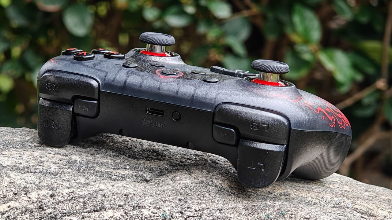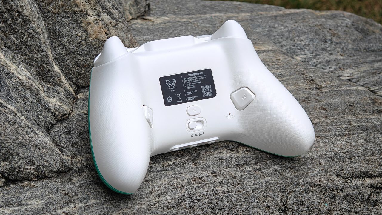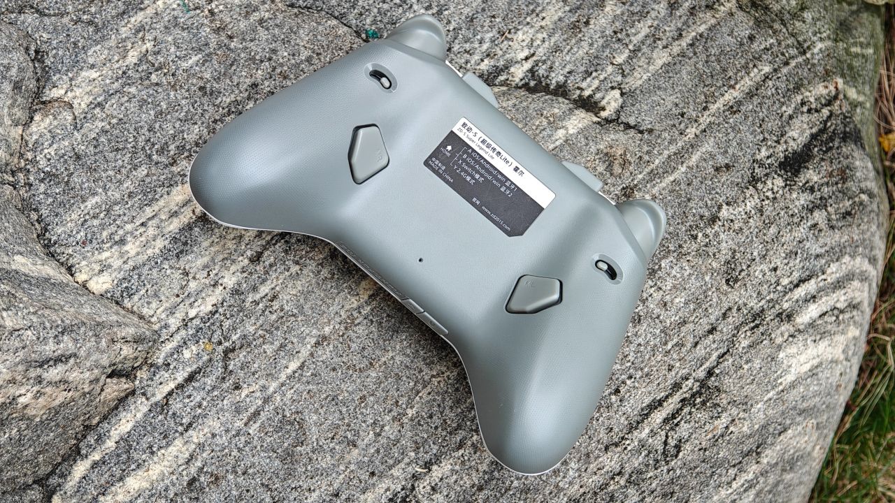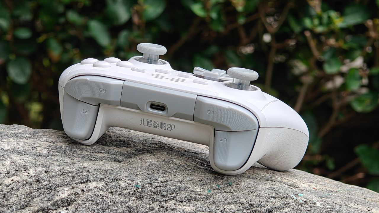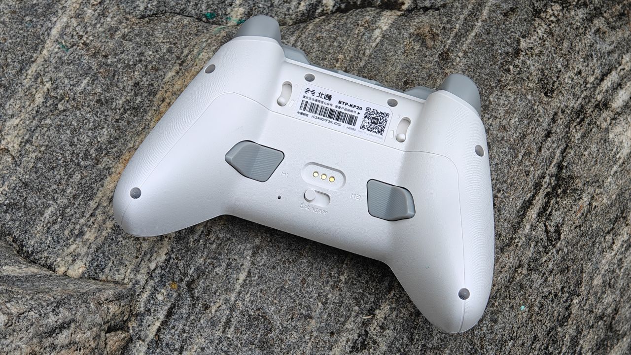 手柄背面握把與扳機肩鍵均有防滑曬紋設計,背面設有兩顆自定義功能的背鍵,頂部爲充電口與配對鍵。