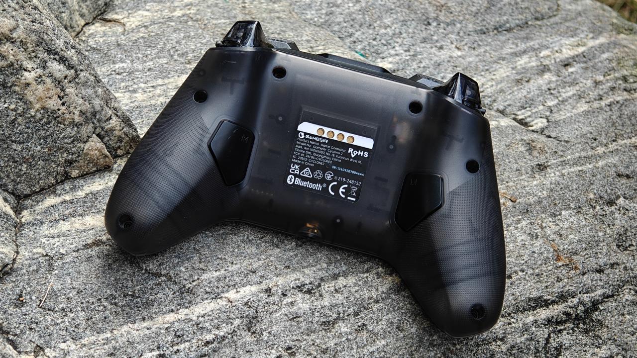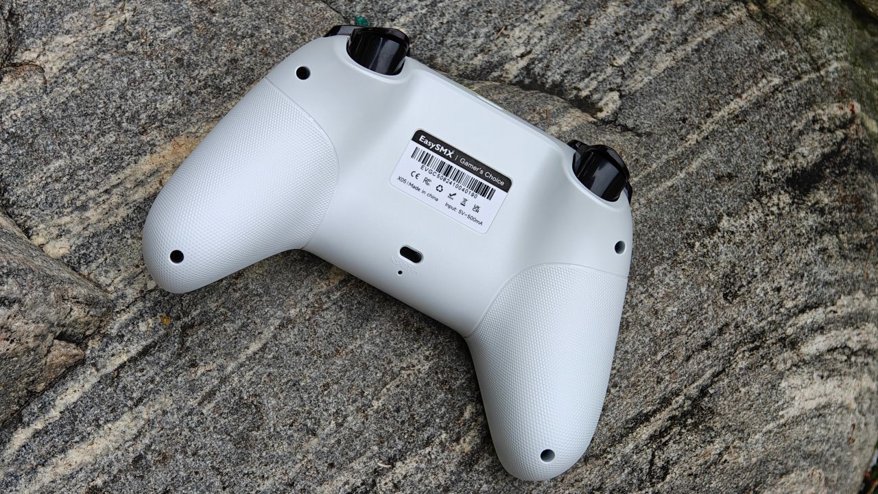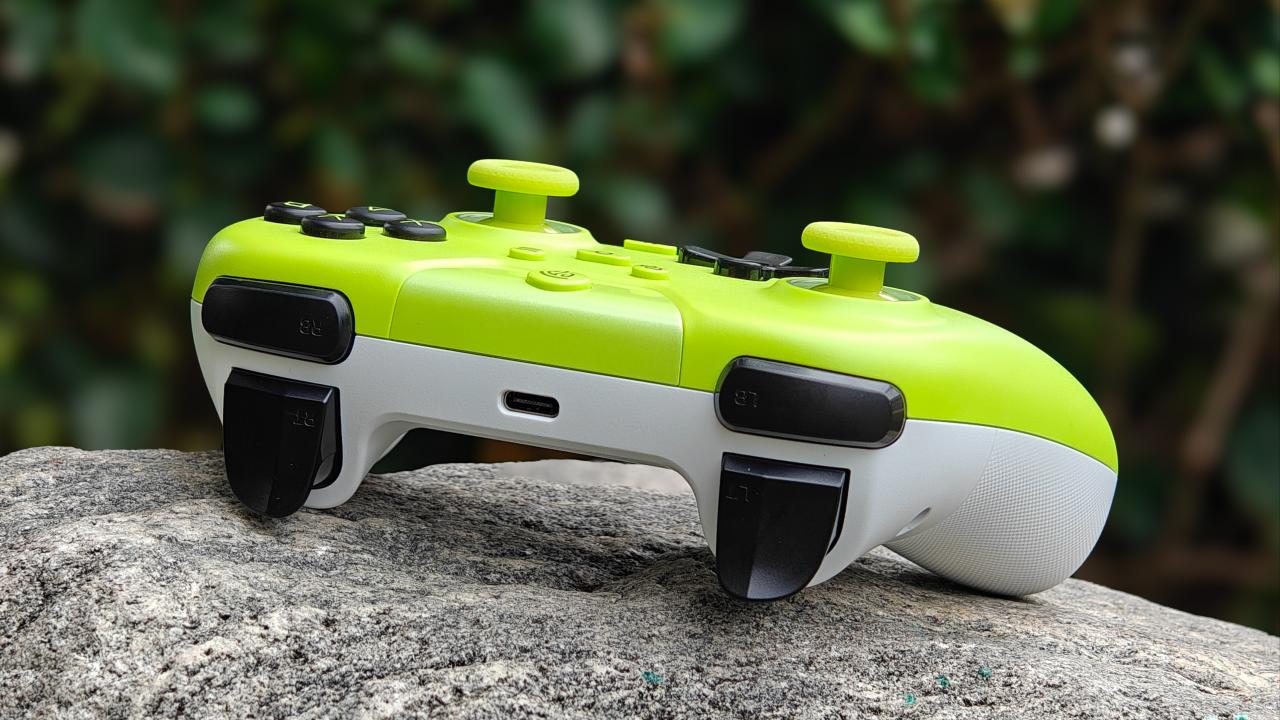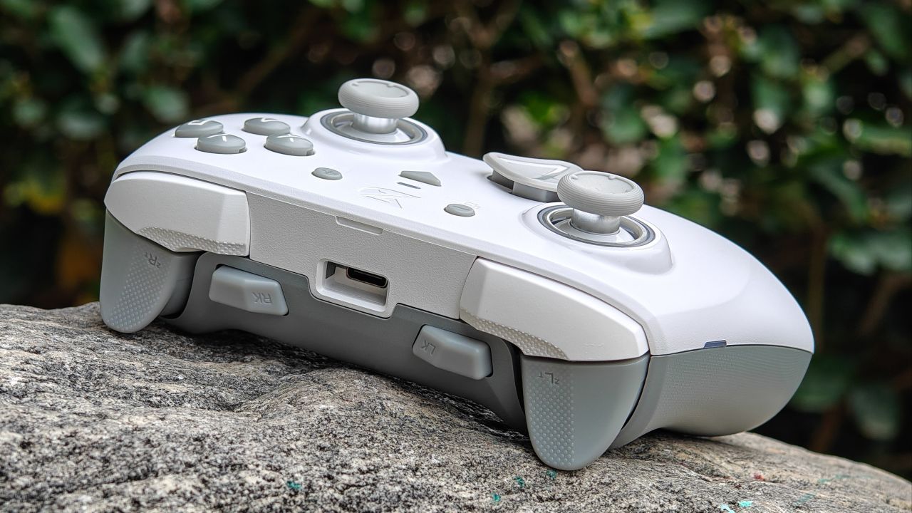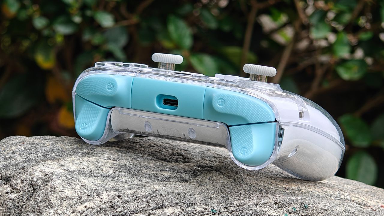 手柄背面握把與扳機肩鍵均有防滑曬紋設計,背面設有兩顆自定義功能的背鍵,頂部爲充電口與配對鍵。