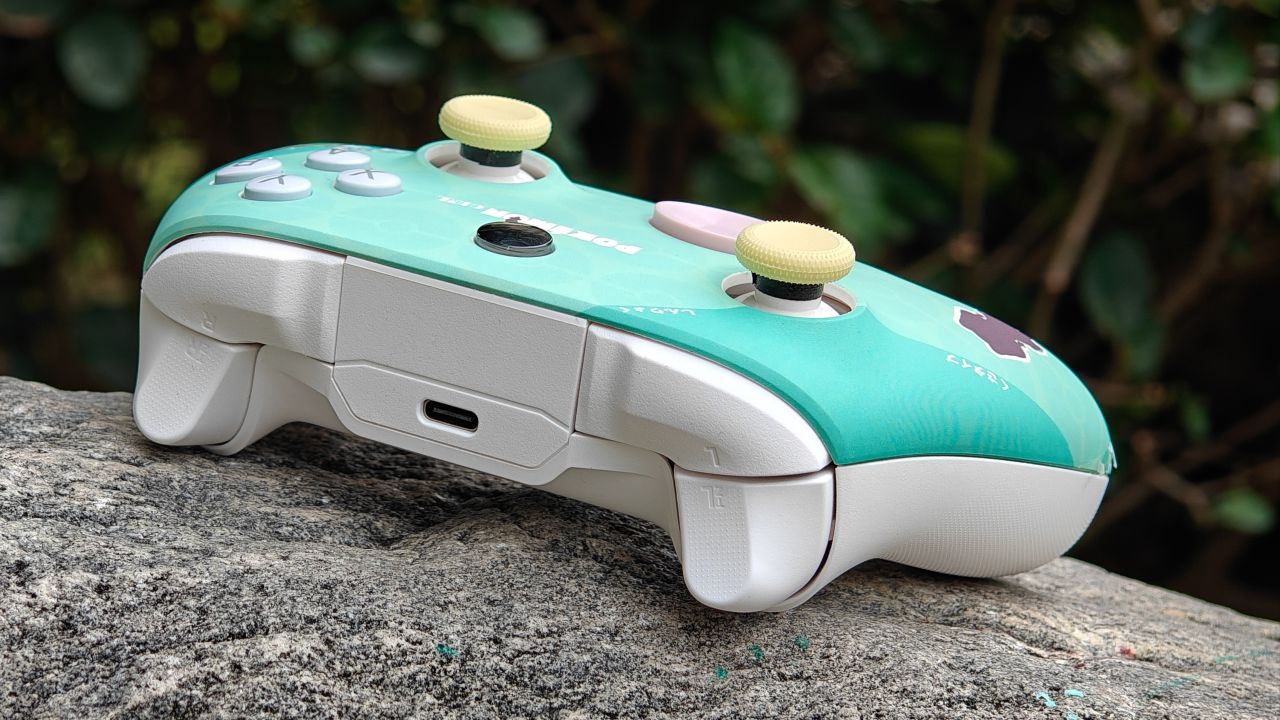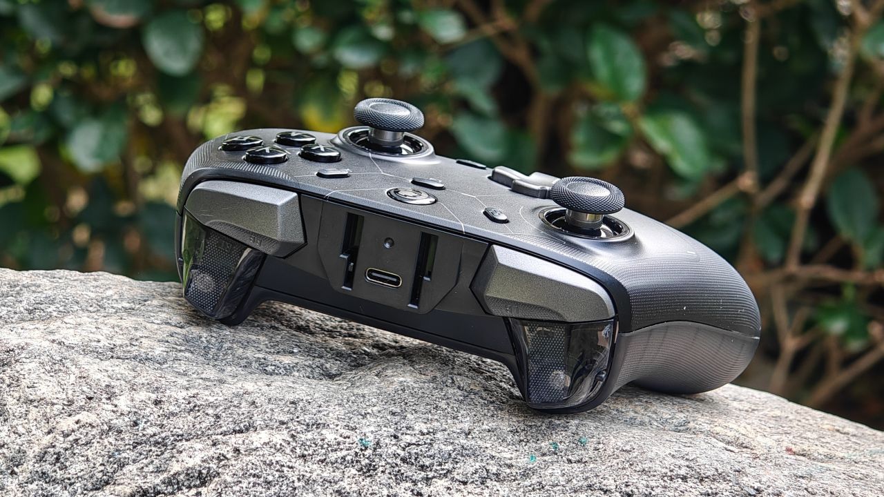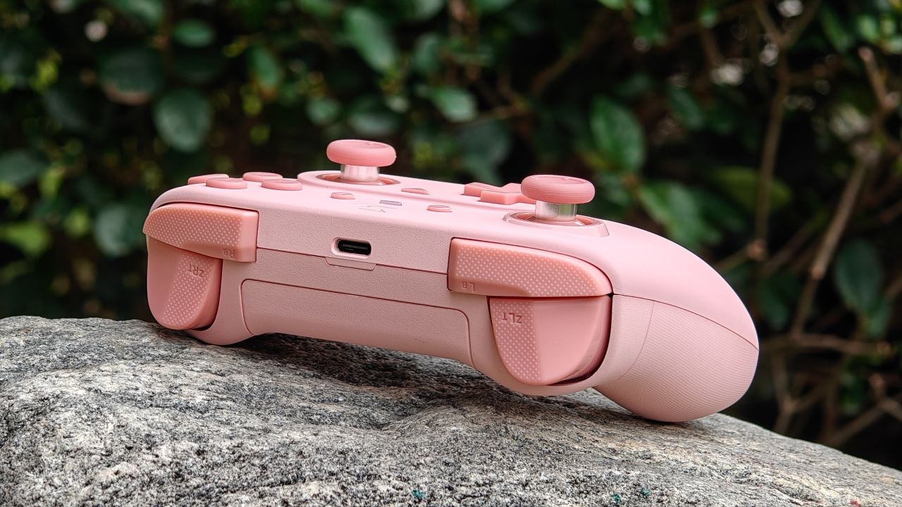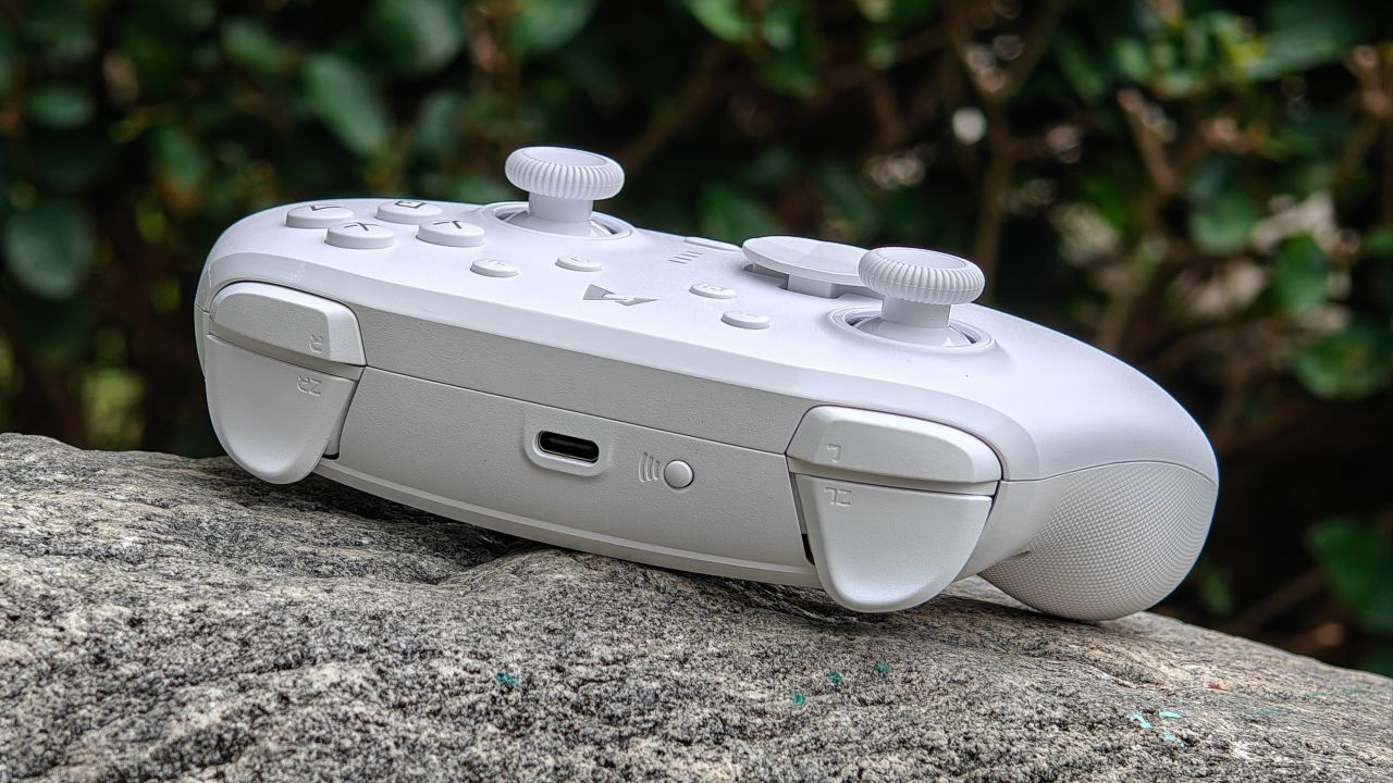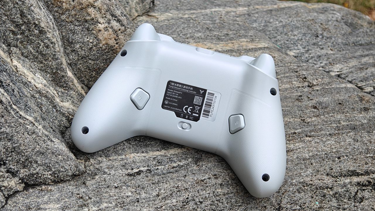手柄背面握把與扳機肩鍵均有防滑曬紋設計,背面設有兩顆自定義功能的背鍵,頂部爲充電口與配對鍵。