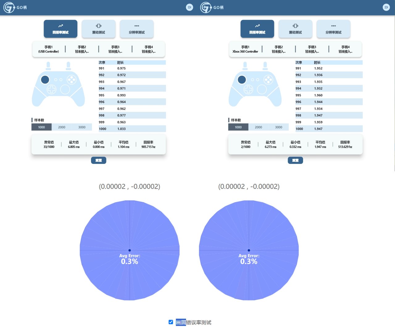 實測回報率與畫圓測試如下