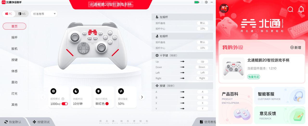 並且手柄支持北通桌面客戶端可以實時調參與 OTA 升級固件,手機也同樣有專屬 APP 進行調參設置,映射等等。