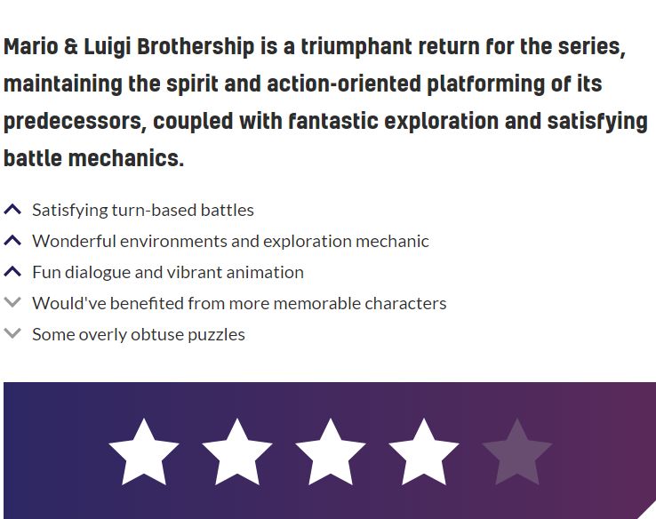 除了出色的戰鬥系統外,《馬力歐&路易吉RPG:兄弟齊航》是一款令人極其失望的復出之作,本作的問題在於遊戲的對話枯燥乏味,遊玩時長過長,性能表現糟糕等,以及對系列作品成功要素的根本誤解。