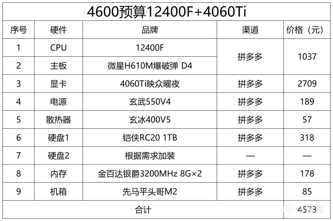 4600預算推薦12400F+4060Ti,12400F+4060Ti是目前最主流的裝機配置,大部分人都會選擇這麼配,其他配件就是標準的16G內存+1TB固態,可以根據個人需求加裝,機箱百元自選,散熱單塔四熱管風冷就穩壓,這裏選的是好安裝的玄冰400V5。