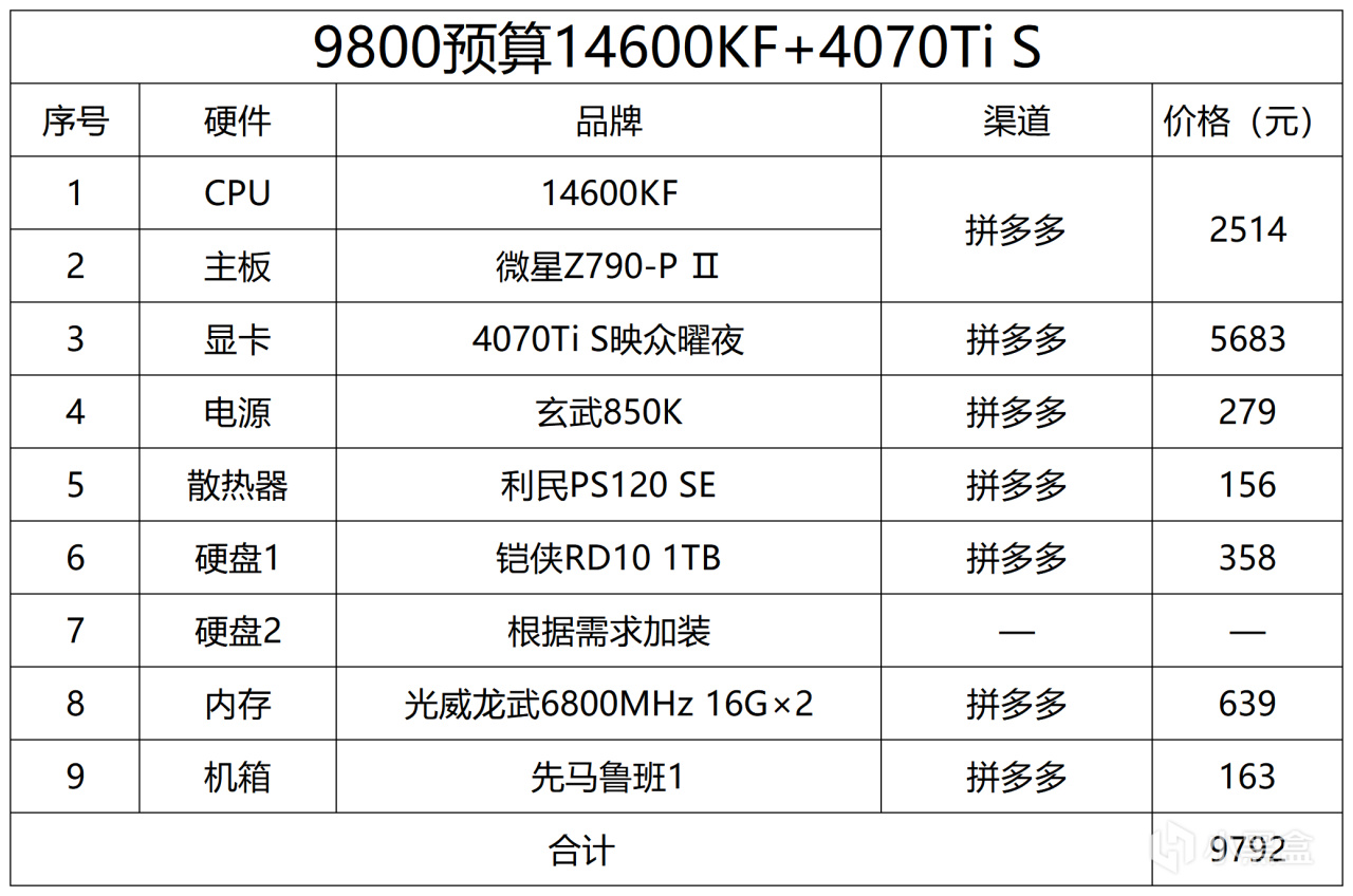 9800預算推薦14600KF+4070Ti S,4070Ti S 4K分辨率下大部分3A遊戲都能高畫質60幀暢玩,固態內存選擇是32G D5+1TB,這裏主板換成Z790,現在Z790的價格和B760M差不多,預算不是特別緊張的話就上Z790吧。