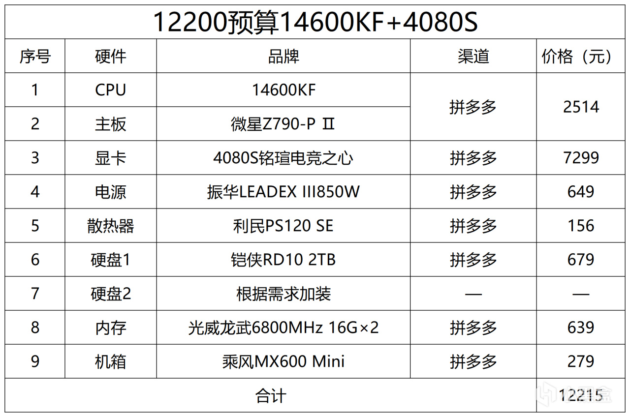 12200預算就是上一套稍微進階一點的配置,電源和機箱升級一下,固態也換成2TB,預算不是很緊張就可以按照這套配。