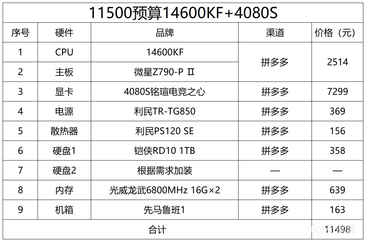 11500預算推薦14600KF+4080S,4080S目前價格7000出頭,玩4K遊戲我覺得現在買4080S還是很不錯的,其他都是標配 32G+2TB 內存和硬盤,電源換成了850W PCIe5.0電源,都是性價比型號,散熱器風冷可以。