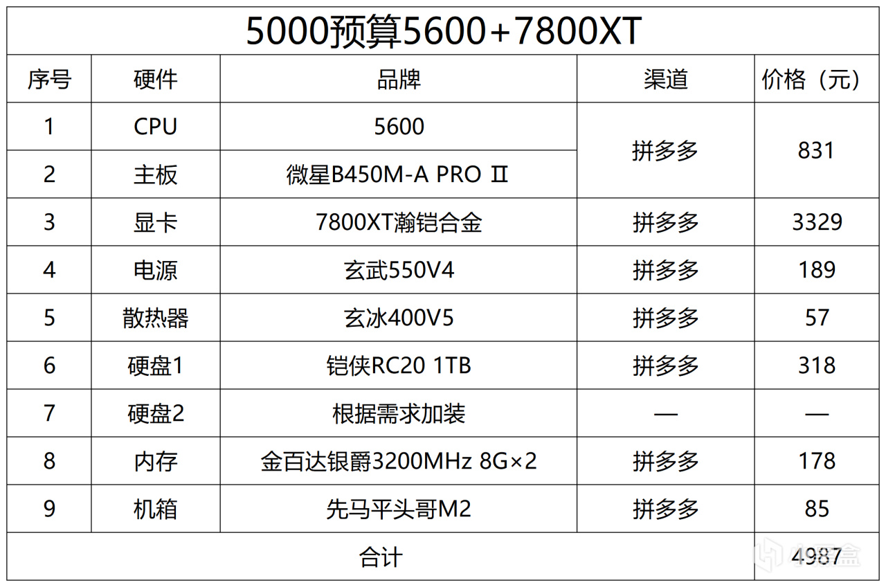 5000預算推薦5600+7800XT,這套配置就是標準的4K入門配置,7800XT的遊戲性能是要比4070稍微強一點的,再加上顯存帶寬沒拖後腿,4K分辨率大部分遊戲都可以開中高畫質,搭配4K顯示器都是可以的。