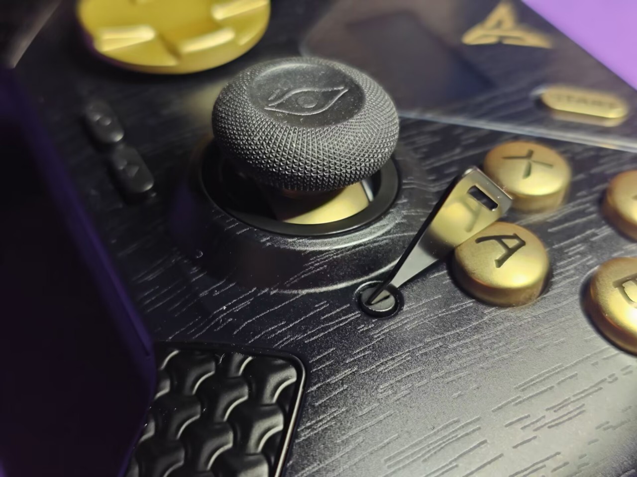 利用杠杆复位结构,跷跷板设计思路和金属轴确保了的精确归中,其中的原理也是展示出了飞智这款手柄想突出的一个“力”。不同于原版的84,黑神话联名款因为去除了可拆卸面板,所以我们可以更方便的使用“小起子”对摇杆力度进行调节,调节范围为30-100gf,满足各类游戏和操作偏好。