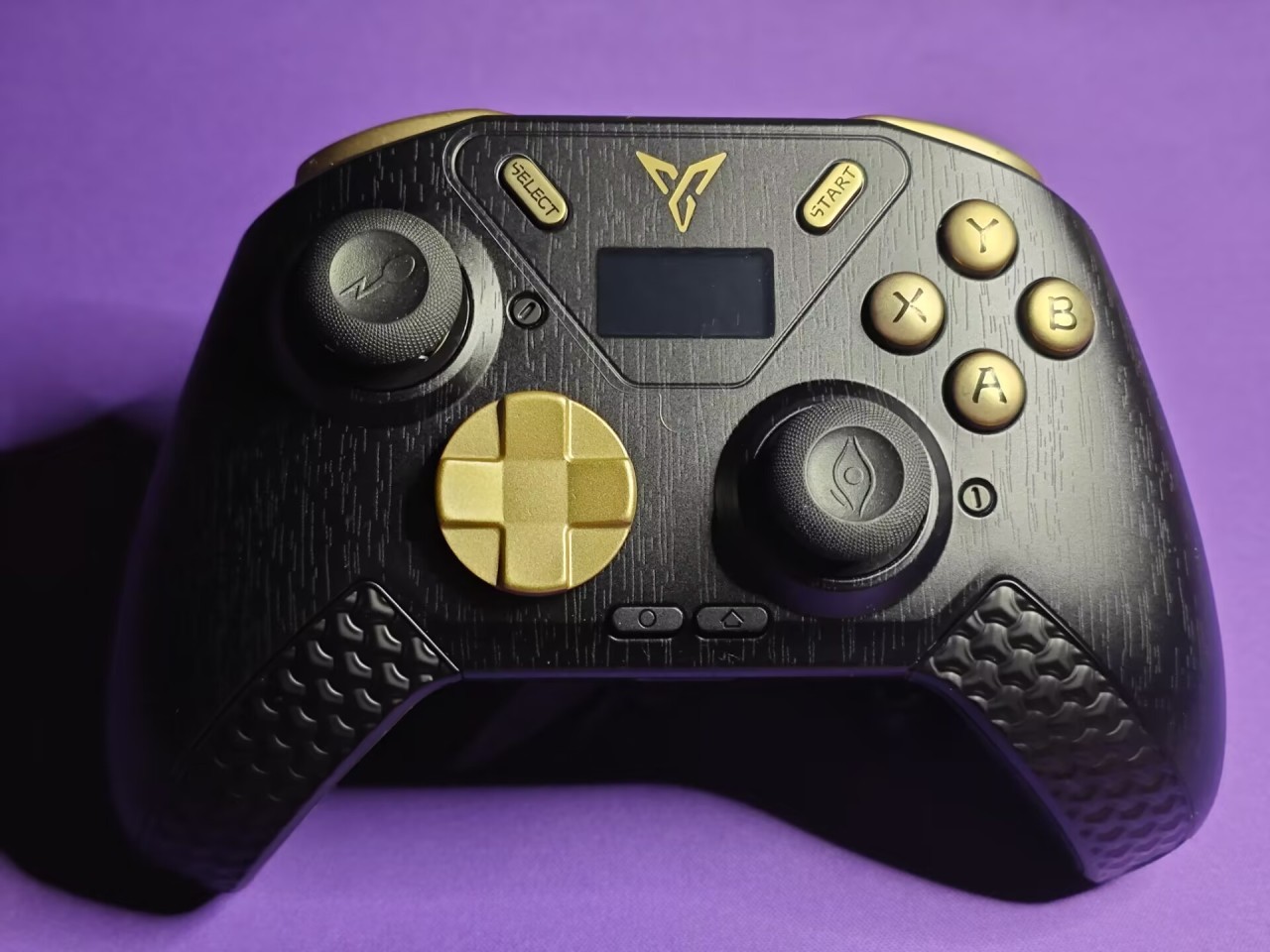 飞智八爪鱼4这次的《黑神话:悟空》联名款还是比较有特色的,用官方的话来说就是“披铠执柄”,黑神话联名款抛弃了原本84的科技感,整体是以黑色为主,所有按键均为暗金色,原本可拆卸的面板变成了一体化设计,面板处做出了木制的花纹对应的是主角的初始武器“六木棍”,握把下方则是做了大圣套中锁子甲的效果,手柄帽上的两个图案分别是“游戏科学”的LOGO,以及“火眼金睛”。