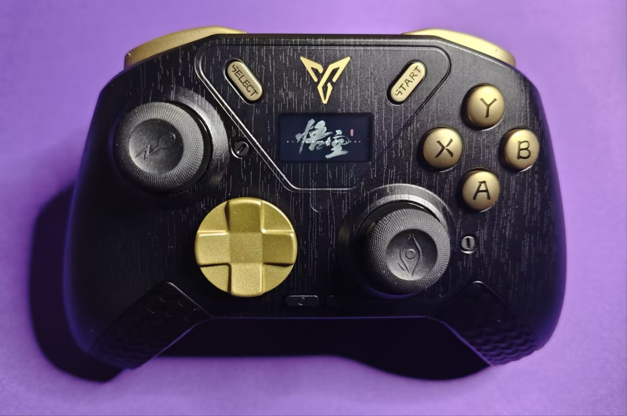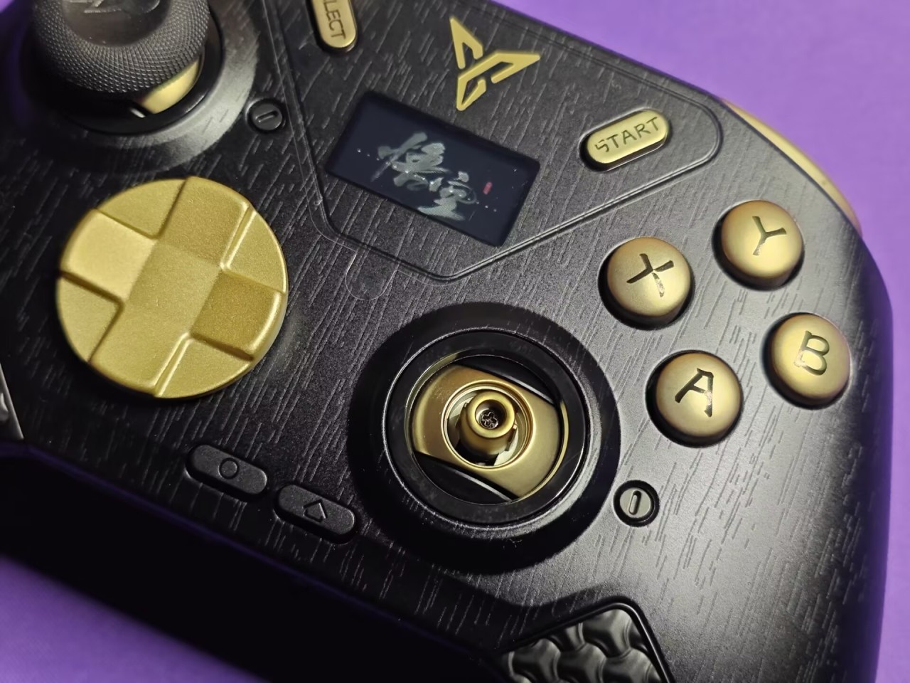 开机状态下屏幕中间的LOGO就是游戏中的“悟空”二字,中间这条白色的小点不知道是官方有意为之还是GIF图没有做好,当然我们自己也可以通过《飞智空间站3.0》去更改小屏幕上的GIF图。这里再顺便给大家展示一下飞智原创的“力调节合金摇杆”(同样还是使用的霍尔传感器),真正做到了0死区不漂移,内置的高速轴承显著减少了间隙和摩擦,实现超丝滑不卡涩的操作体验。