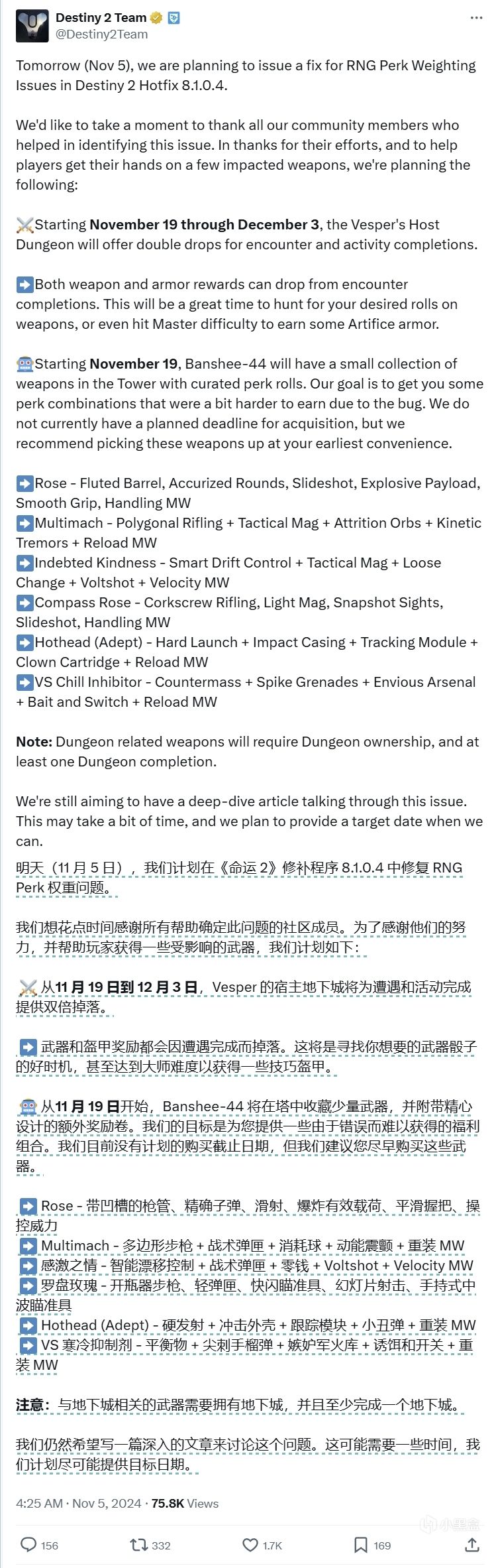 爲了感謝發現此問題的玩家,BUNGIE提出如下謝禮(補償)