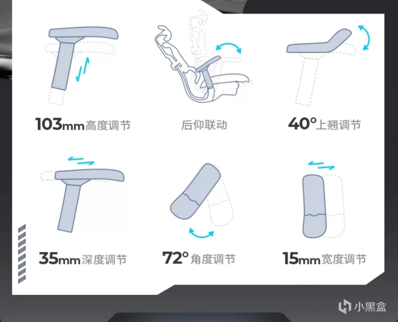 以及还有椅子的手托,这个手托的功能也是相当之多,不仅支持上下调节,还支持左右旋转,更能随着椅子的后仰和前倾改变角度,最绝的是,它的前端还能翘起,总之就是不管你处于什么姿势,它都能恰到好处的承托你的手臂,以让你达到更轻松的状态。