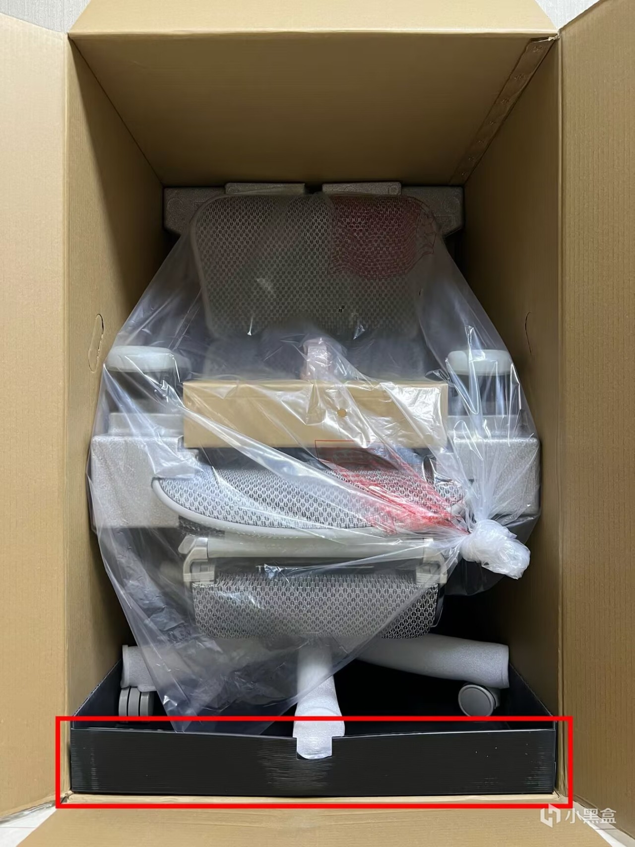 而保友这把金豪e2由于采用了一体式发货,因此打开包装就可以拖出来使用,而且上图我红框框出来的这个地方也设计的很好,只需要往前打平,就能把椅子直接拖出来,非常的方便。