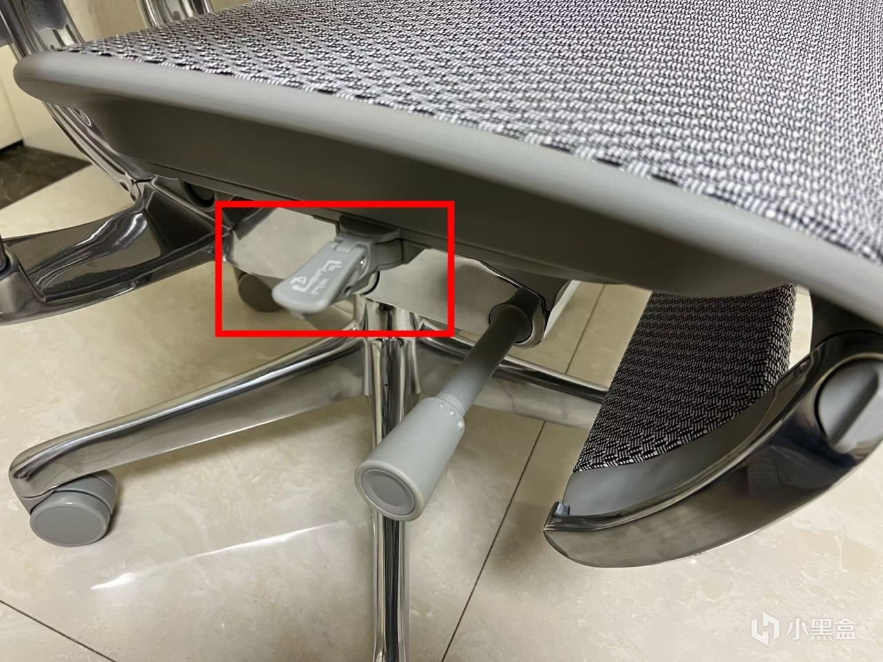 而且使用起来也很简单,红框的这个把手,往后掰就是后仰,往上提就是上升和下降,往前推就是解锁座椅滑动,对,椅子的座椅也是可以前后滑动的,因此当坐在上面的时候,可以自由调节腿部和椅子之间的空间,以达到最舒适的距离。