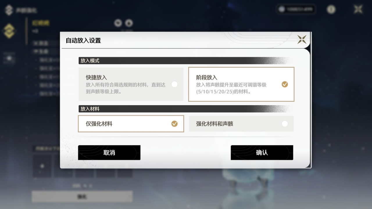 强化声骸时将可以自动【阶段放入】强化素材,来强化至最近的可调谐等级(5/10/15/20/25),声骸强化体验将更加高效,对于强化也是非常有帮助的。