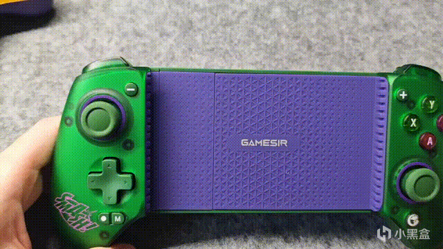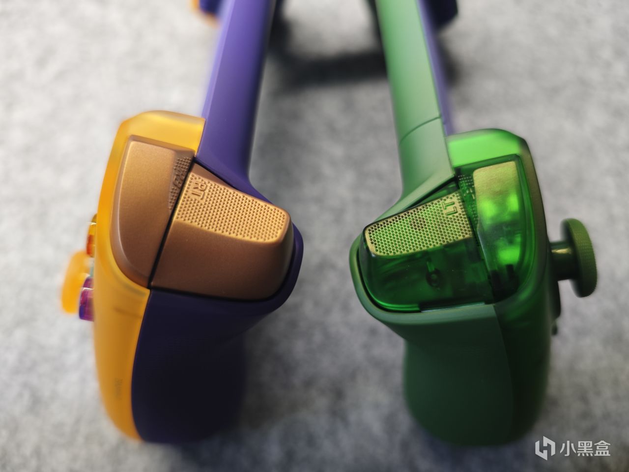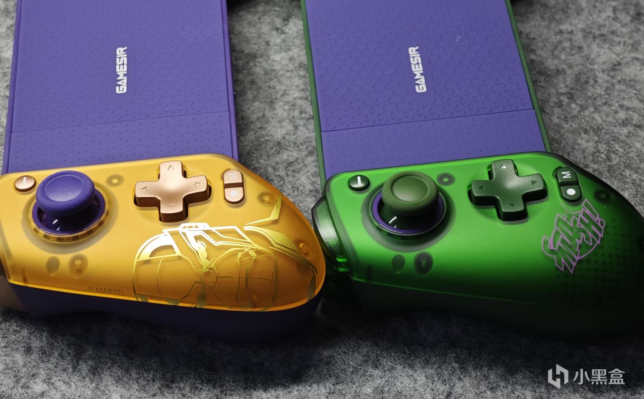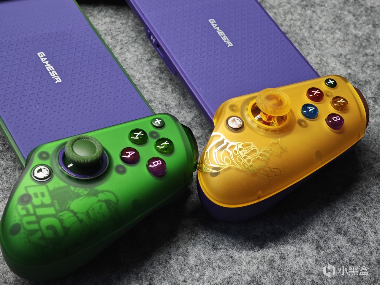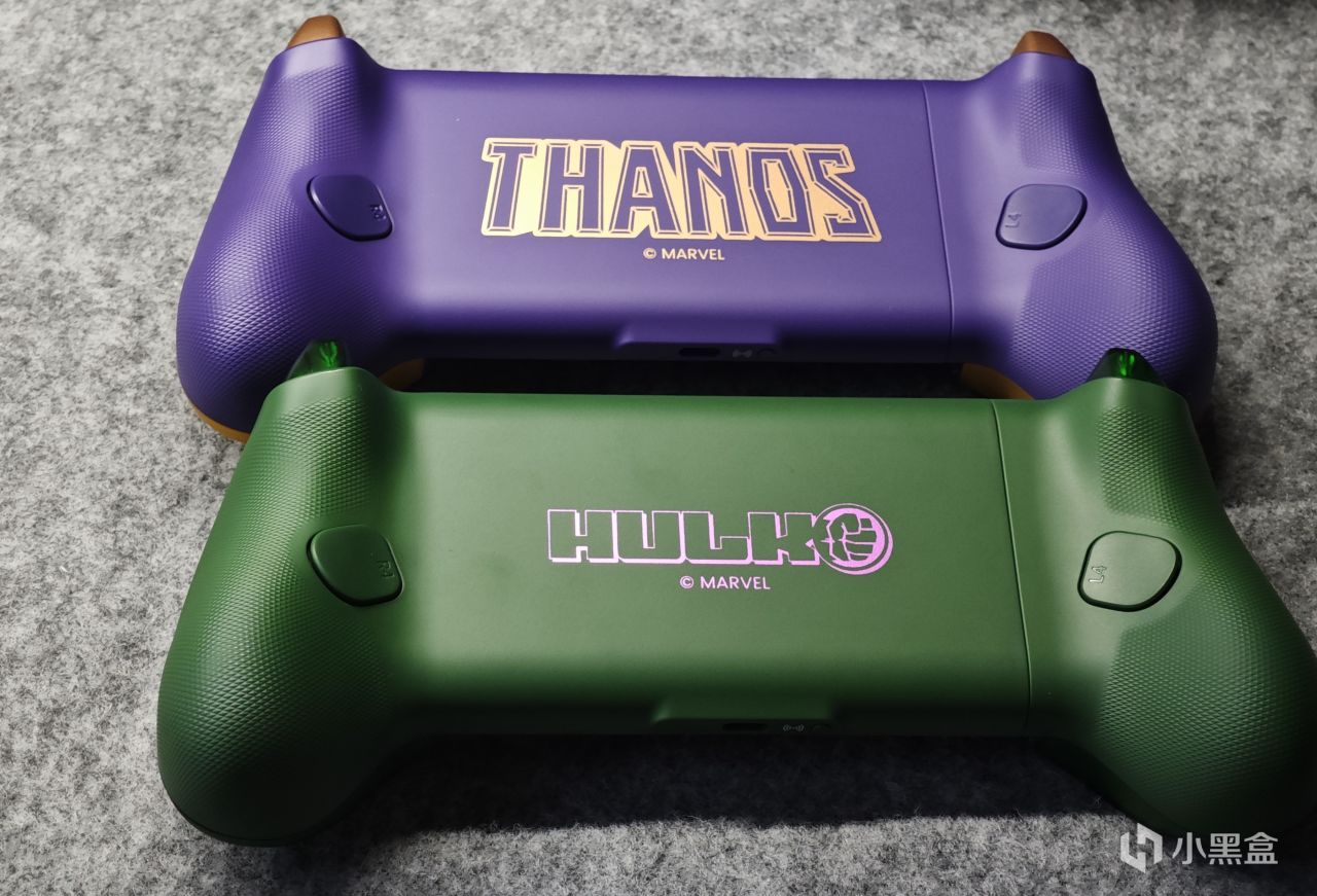 手柄握把的外观是灭霸和绿巨人的图案,灭霸款的配色的黄色和紫色,绿巨人款的配色是绿色。面壳、ABXY、摇杆都可以拆下来更换。