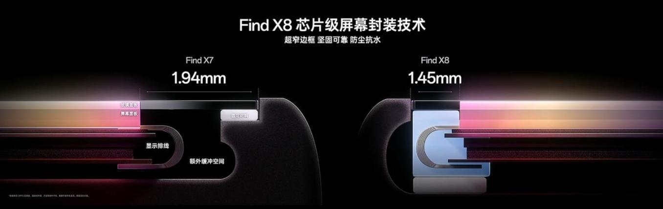 通過芯片封裝技術將Find X8的顯示排線區域保護起來,這樣便可以省去一個緩衝空間,使得手機的邊框大幅縮減。