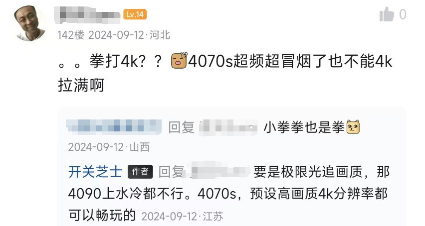 这些人或被厂家误导、或被消费主义洗脑、或主观上“觉得”:4070S就是2K游戏卡,4070TI SUPER是4K入门卡,4080S才算4K正式卡......