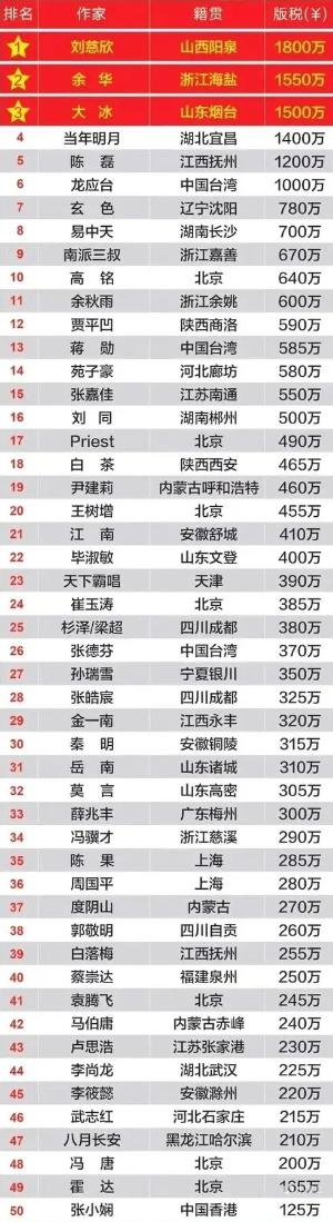 在作家富豪榜中,餘華成爲傳統純文學的代表人物,《活着》銷量已經突破2000萬冊,餘華以1550萬的版稅收入,高居第二位,創下了當代中國純文學的銷量奇蹟,餘華的作品也被翻譯成多國語言出版,獲得過意大利“格林扎納•卡佛文學獎”和法蘭西文學和藝術騎士勳章,此外餘華的《許三觀賣血記》、《兄弟》、《在細雨中呼喊》等作品也深受讀者喜愛!
