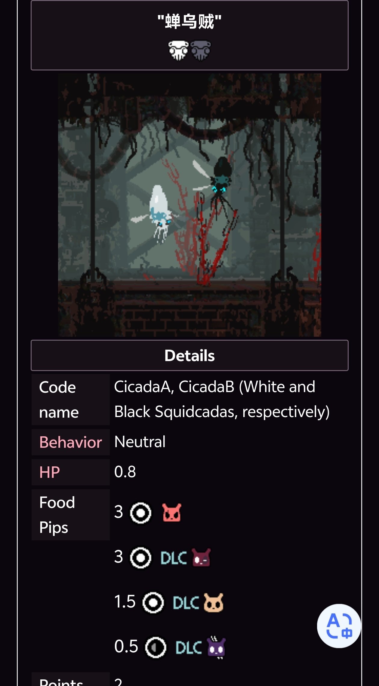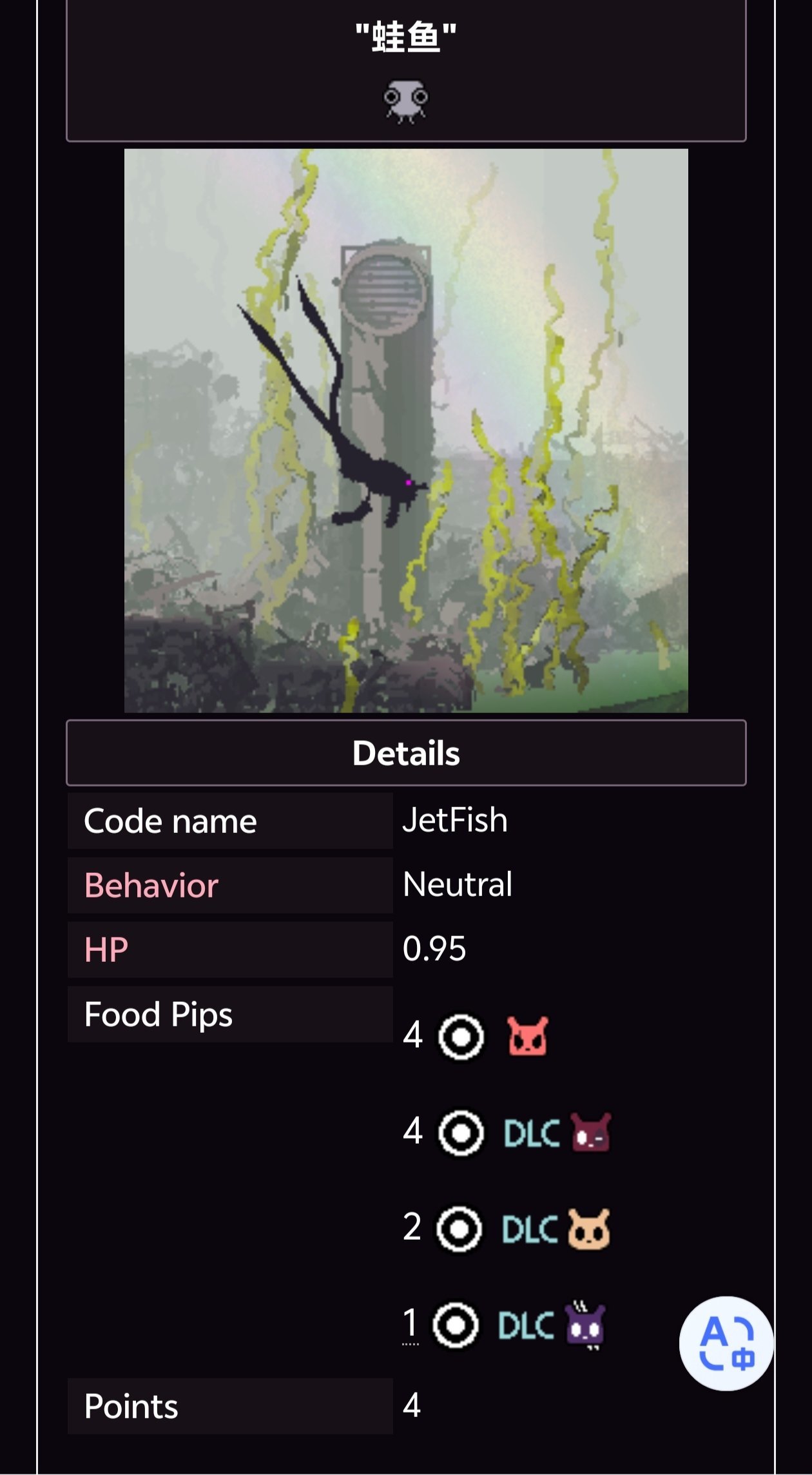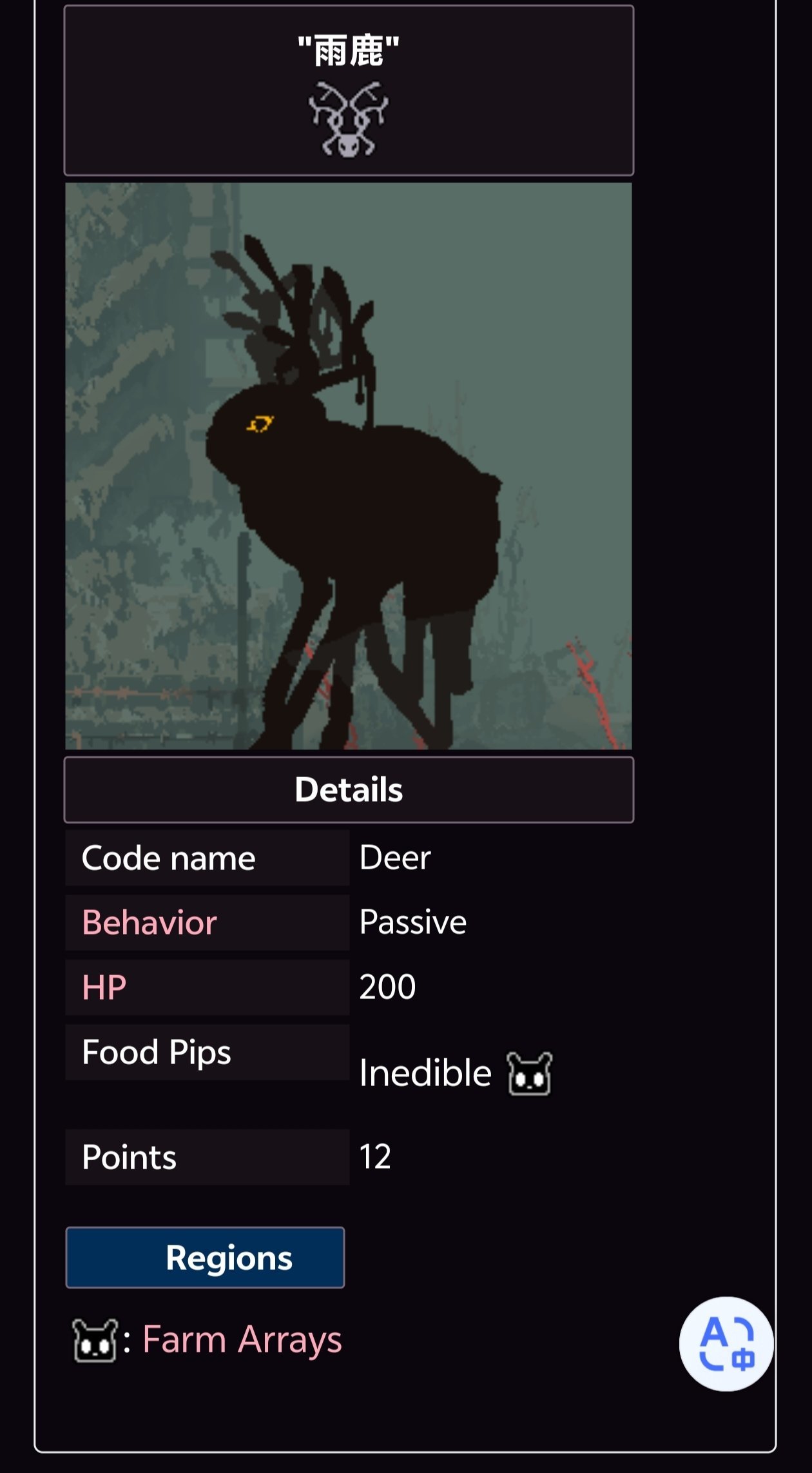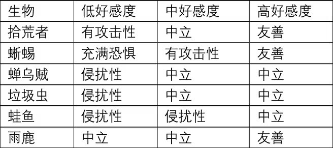 如果玩家與某一特定生物的好感度足夠高或足夠低,那麼該生物在蛞蝓貓附近時,習性會發生顯著變化。下方的表格列出了所有擁有好感度機制的生物,還有它們對應的習性。(忘補蛞蝓貓崽的了)