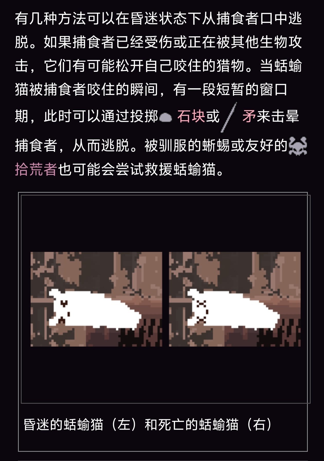 雨世界在計算傷害是有兩套算法。其中一種是血量算法 把一矛的傷害算作爲1,石頭。。(幾乎沒傷害吧)例如拾荒者的血量是1多一點,你需要多大的一下來防止“詐屍”。第二種屬於概率計算(玩家專屬)有些生物的攻擊是有概率致死的,有時候蛞蝓貓沒有死只是被擊暈或者吊住,這時有時候是可以逃脫(蜥蜴之間幹架,拾荒或者貓崽幫助等)