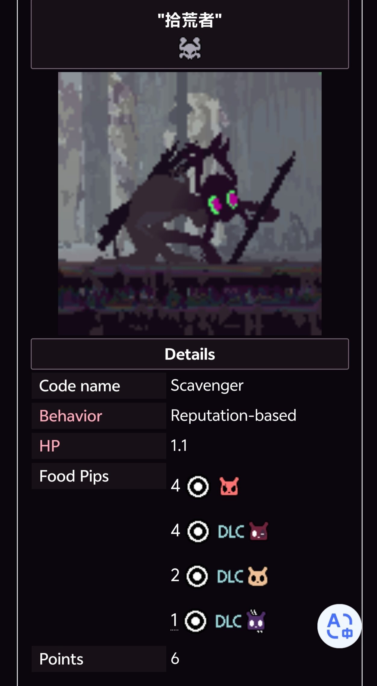 大多數生物都有性格,但拾荒者受六種性格修飾因子的影響是最大的(其實還有貓崽)。這些因子可以控制和影響生物習性(Behaviors)——它們分別是攻擊性(Aggression)、勇氣(Bravery)、強勢性(Dominance)、活力(Energy)、焦慮性(Nervousness)和同情心(Sympathy)。(來自雨世界Wiki)具體感興趣去自己查吧。(我懶太多了)