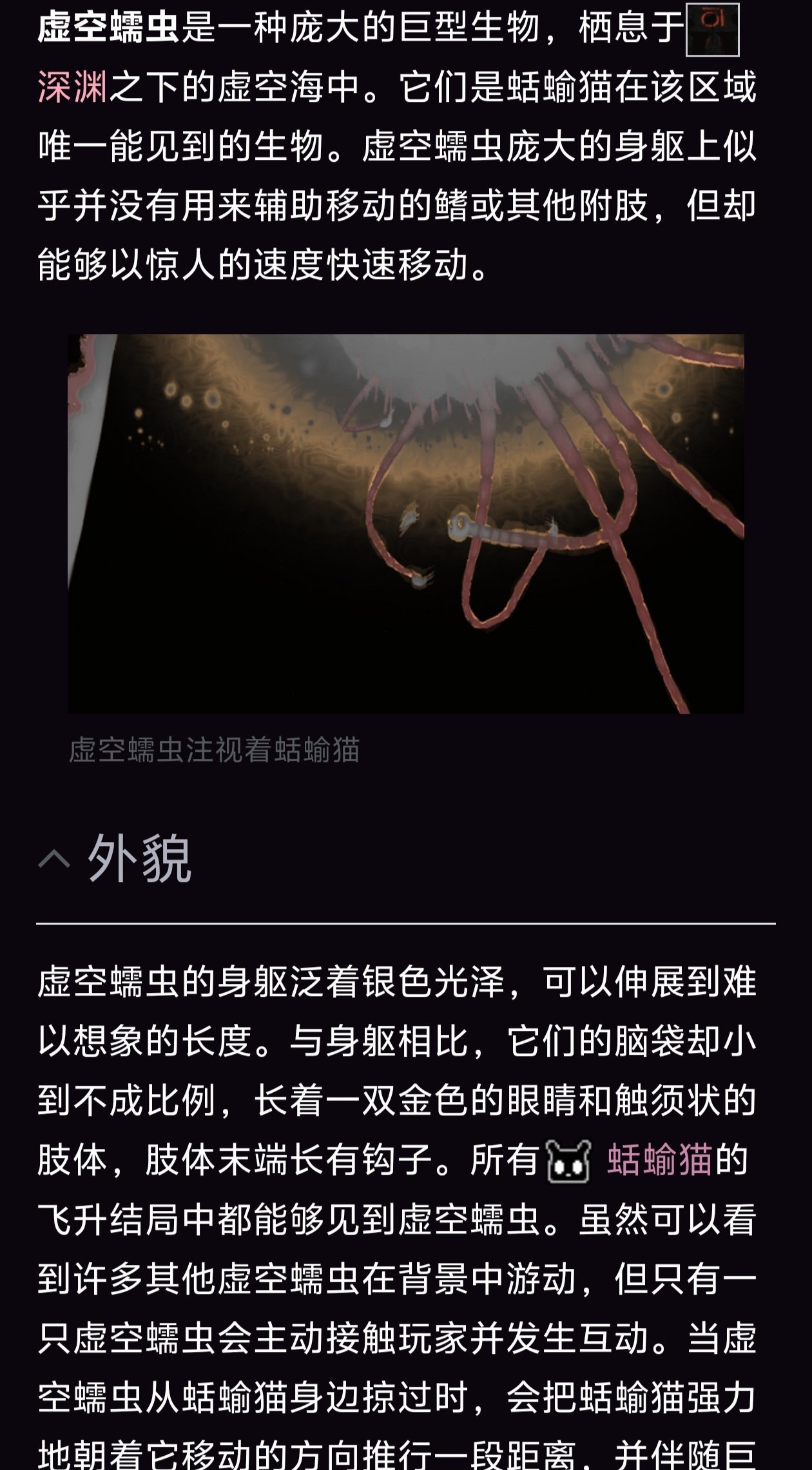 在蛞蝓貓跳入虛空流體,向下遊了幾個屏幕遠的距離之後,可以看到許多虛空蠕蟲。較近的虛空蠕蟲可能會間接推動到蛞蝓貓朝自己前進的方向移動。游到虛空蠕蟲羣落下方後,一隻虛空蠕蟲會帶着獨特的轟鳴聲出現。稍加檢查之後,它會用一根線繫住蛞蝓貓,先稍稍向上遊動,然後直衝虛空海深處,速度之快以至於蛞蝓貓看起來都被扭曲了。一段時間後,虛空蠕蟲逐漸停止移動,鬆開蛞蝓貓,然後重新向上游去。蛞蝓貓被留在了這處幽邃的深淵裏,只有微弱的白光和音樂引導着它走向最終的結局
