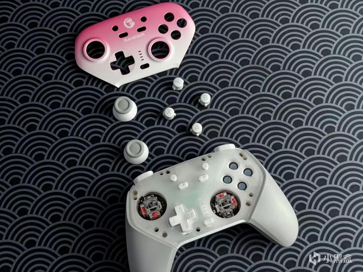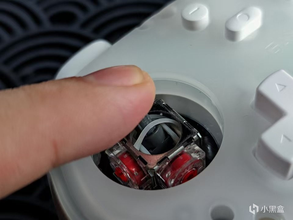 從圖上也可以非常明顯的看出,搖桿部分採用的是小雞定製款的霍爾搖桿設計,其壽命可以達到500萬次,整體順滑度也還算不錯,同時面蓋上是做了POM防磨環的設計,所以壽命以及觀感上都不用擔心,其本身有自帶死區,但通過小雞遊戲世界可以將其調整爲0死區,且搖桿曲線較爲平直,在霍爾搖桿中算是精度比較高的版本,當然還是會有彎度的,還是不能和碳膜搖桿比極限精度的,畢竟霍爾不會直接接觸,壽命和精度在這方面還是沒有兩全法的。