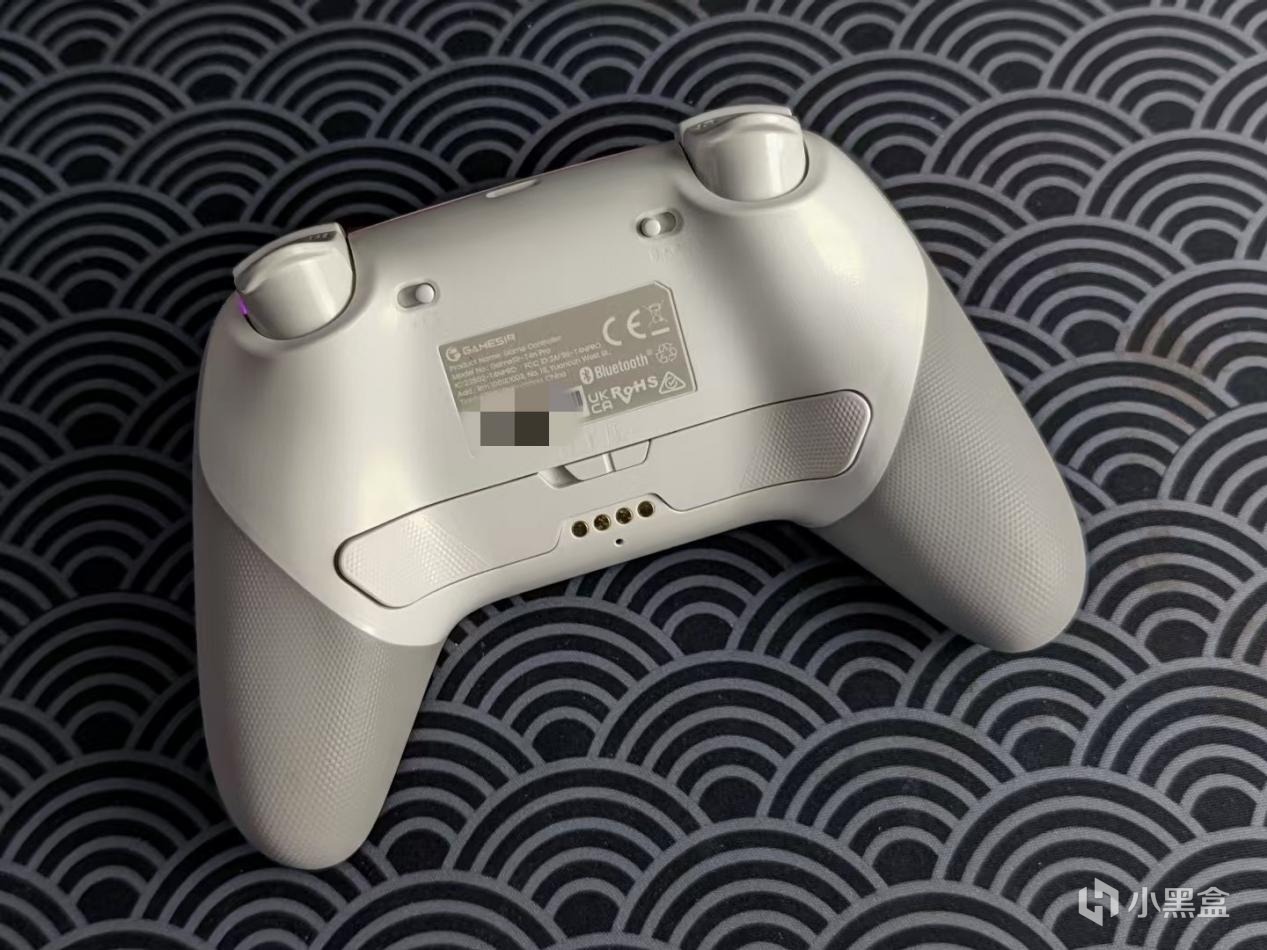 手柄背部除了上面提到的扳機鎖外,還有這一對可自定義背鍵以及三模切換撥杆,底部則是四個底座觸點,算是比較常規的配置,當然這種一字型背鍵要比傳統按鍵舒服很多,希望後續可以在更多手柄上見到這個設計。