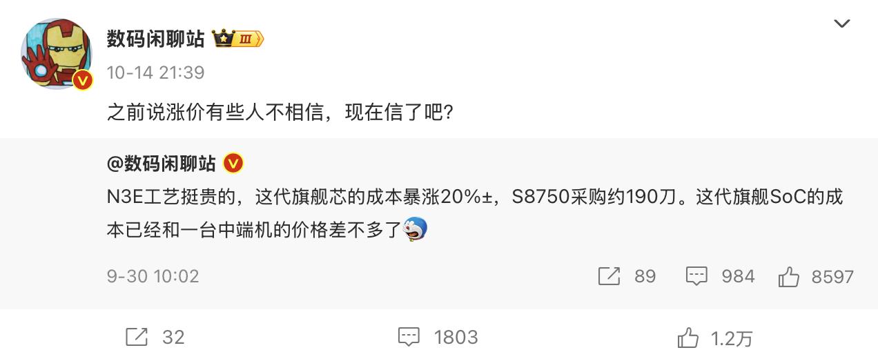 此前,@數碼閒聊站發文表示,因爲第二代3nm製程工藝,使得這代旗艦芯片成本增加了20%,其中驍龍8至尊版芯片(S8750)的採購價約190美元,摺合人民幣約1361元。