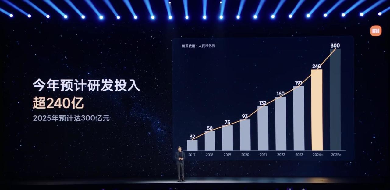 在小米 15系列發佈會上,雷軍表示,小米今年預計研發投入超過了240億元,到了2025年,預計研發投入達300億元。