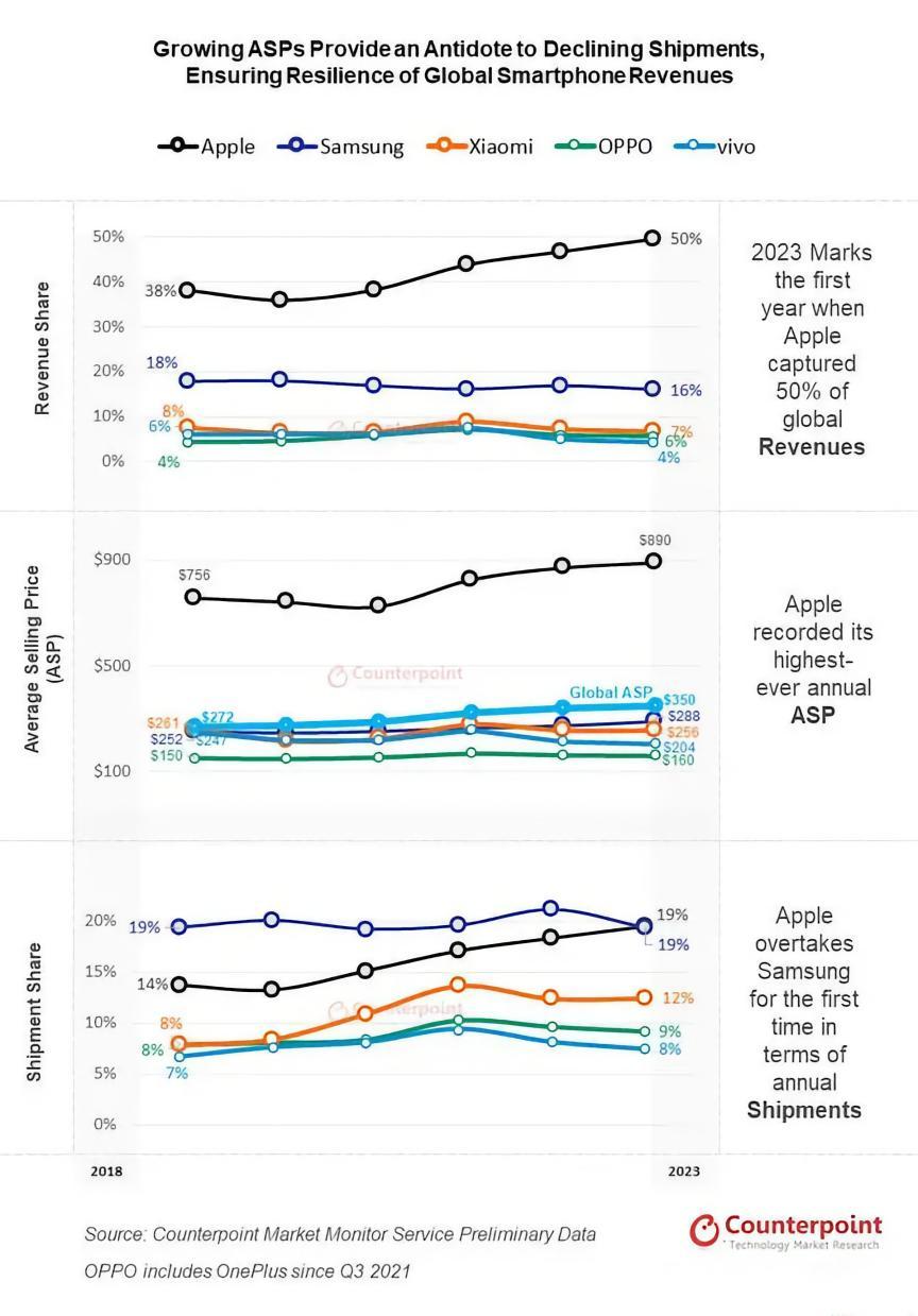 手機高端化的好處顯而易見,可以爲廠商們帶來鉅額收益。以蘋果爲例,市場調研機構Counterpoint Research發佈的最新報告顯示,2023年全球智能手機市場,蘋果依舊是最賺錢的手機廠商。2023全年,iPhone銷售額達到了2030億美元,摺合人民幣約14452億元,佔據了全球手機市場50%的營收。