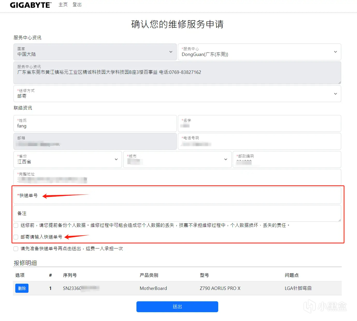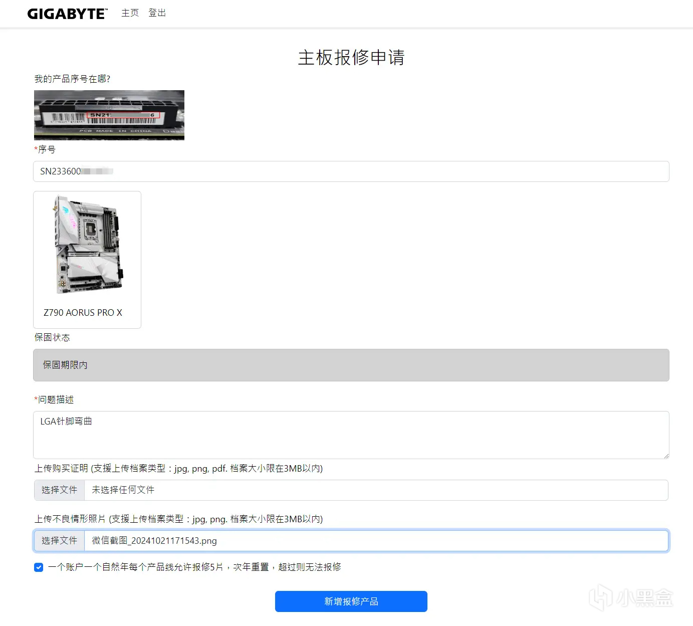 只不过在他人生中第二次装机时迎来了“翻车”:装CPU不小心从手上掉落,也就刚好掉在CPU的针脚上!而我也在边上完整目睹了这一切。并且开始我们还试着能否用针挑正,结果发现完全搞不定,所以就只能送修了。联系了卖家后,对方说直接自己送修更快,关键是还免费!而且还不需要提供购买发票!于是乎我也顺带的首次体验了技嘉的网上送修。