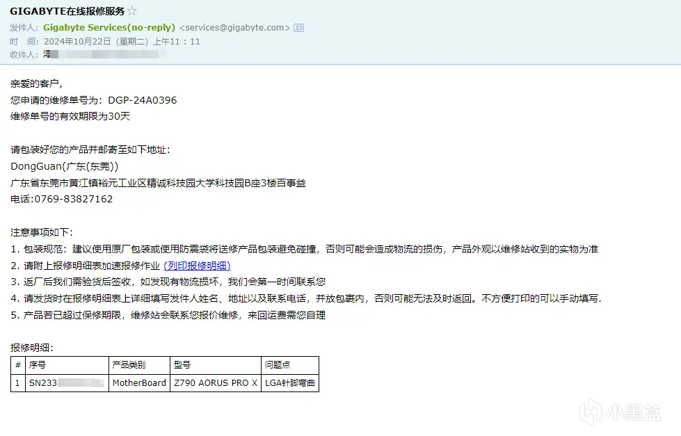 同时,我邮箱也收到了来自GIGABYTE在线报修服务的邮件,主要是注明邮寄时需要的一些注意事项(可关键的我主板早就发走了)。