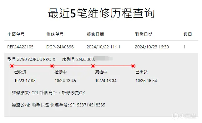 此次网上报修的整个过程,可以所让我对技嘉的售后有了全新的认识。一方面是方法简单,直接网上申请就行,而且还不需要发票,并且像我这样人为损坏针脚都可以免费修;另一方面是效率超高,连上快递时间才耗时4天左右,也是我目前享受过的最高效的送修服务。