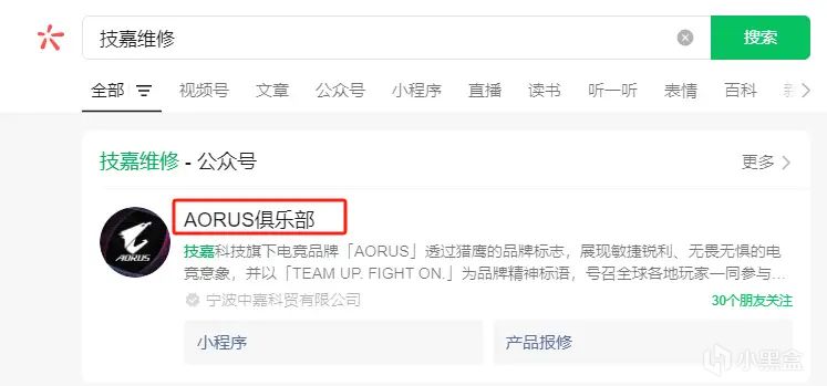 申请过程还是比较简单,我直接是在微信上搜索:技嘉维修,给我弹出的就是AORUS俱乐部,下方就有产品报修选项。