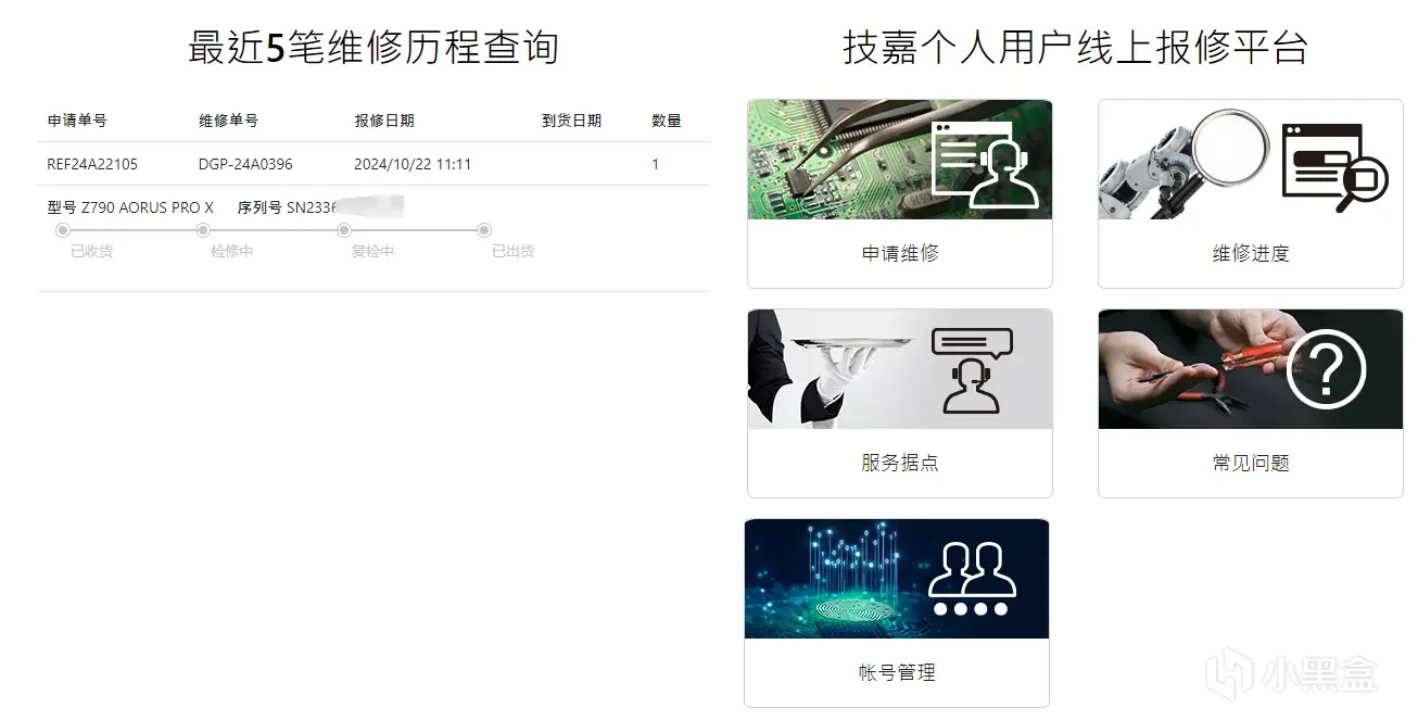 填写完成后到主页面还可以看到该主板的维修进度,有收货、检修、复检、出货几个过程。