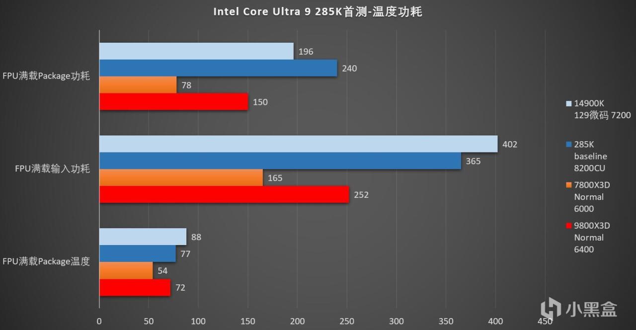 至于温度功耗方面,自然是更不用说了,这次解决了X3D缓存的积热问题后,9800X3D的功耗终于回到了标称的120W TDP的正常水平,之前7800X3D的功耗虽然低得离谱,但是因为积热想拉也拉不上去,造成综合性能偏低,而这次9800X3D就改善了这个问题,一举把综合性能提升了20%,同时温度依然维持在很低的水平上——就这依然比285K低100W,比149K低150W!