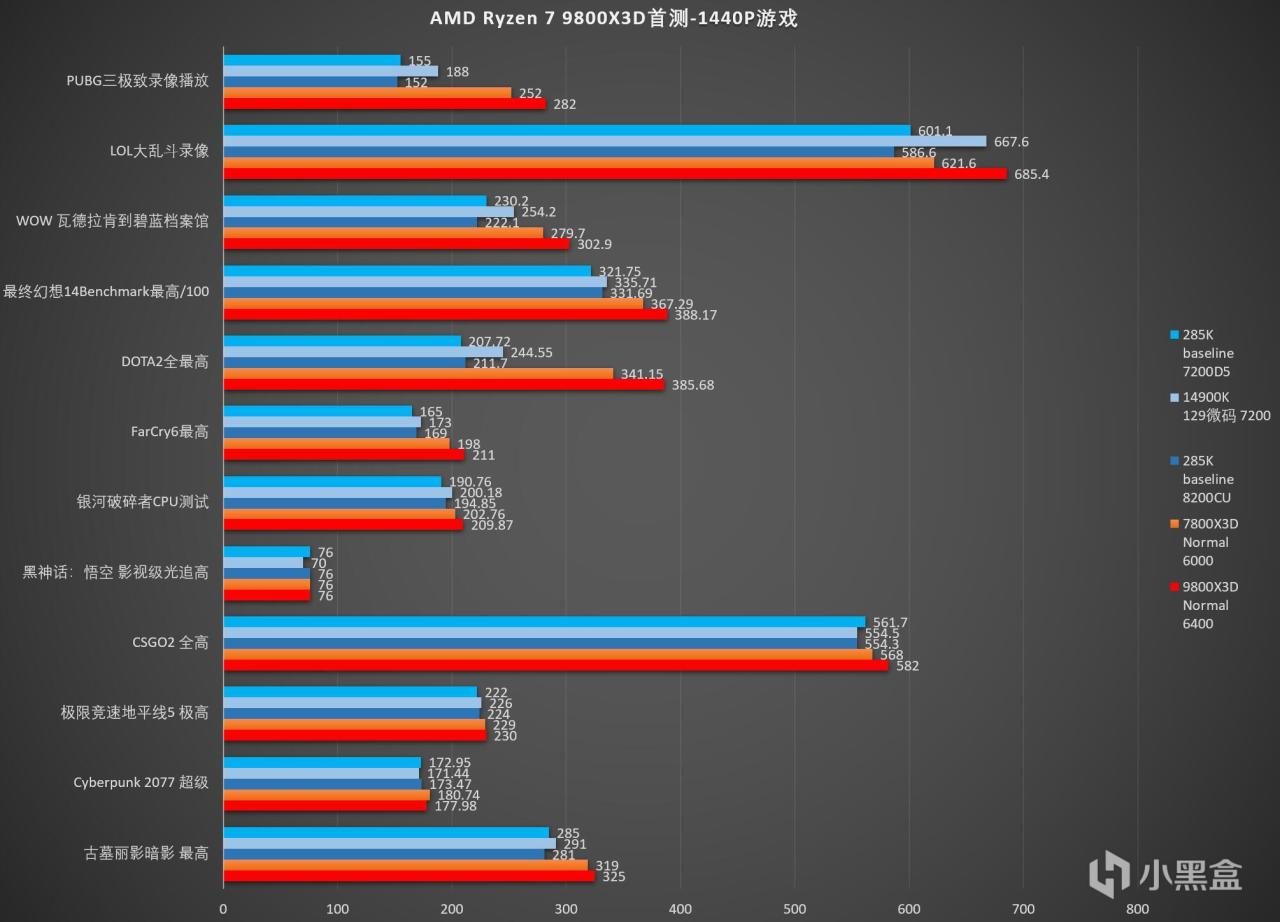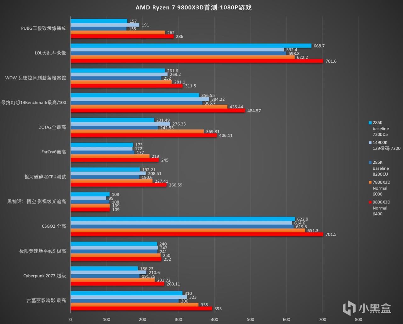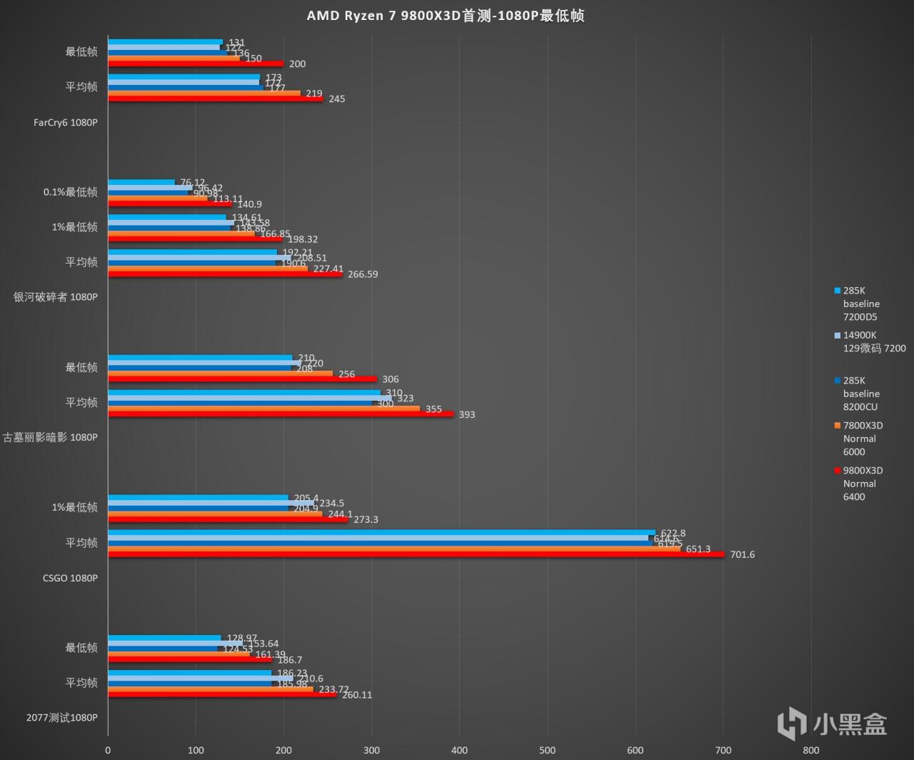 上面的还都是平均帧成绩,如果加上最低帧的表现,那就更加离谱了......随着CPU和显卡的性能越来越高,显示器刷新率也越来越高,很多玩家开始关注最低帧的表现了。毕竟1秒100一秒500和2秒都是300帧的游戏,在实际体验上就是卡顿和丝滑的区别,这更是大缓存的优势所在——结果就是有几个游戏中9800X3D的最低帧都比U9 285K的平均帧高......当然我这里只是在上面的几个游戏中找了几个提供最低帧测试的游戏来说明一下情况,而不是对比性能,毕竟有的游戏285K还是能看的......相比7800X3D,9800X3D的最低帧提升也十分明显,体验会上升更多。