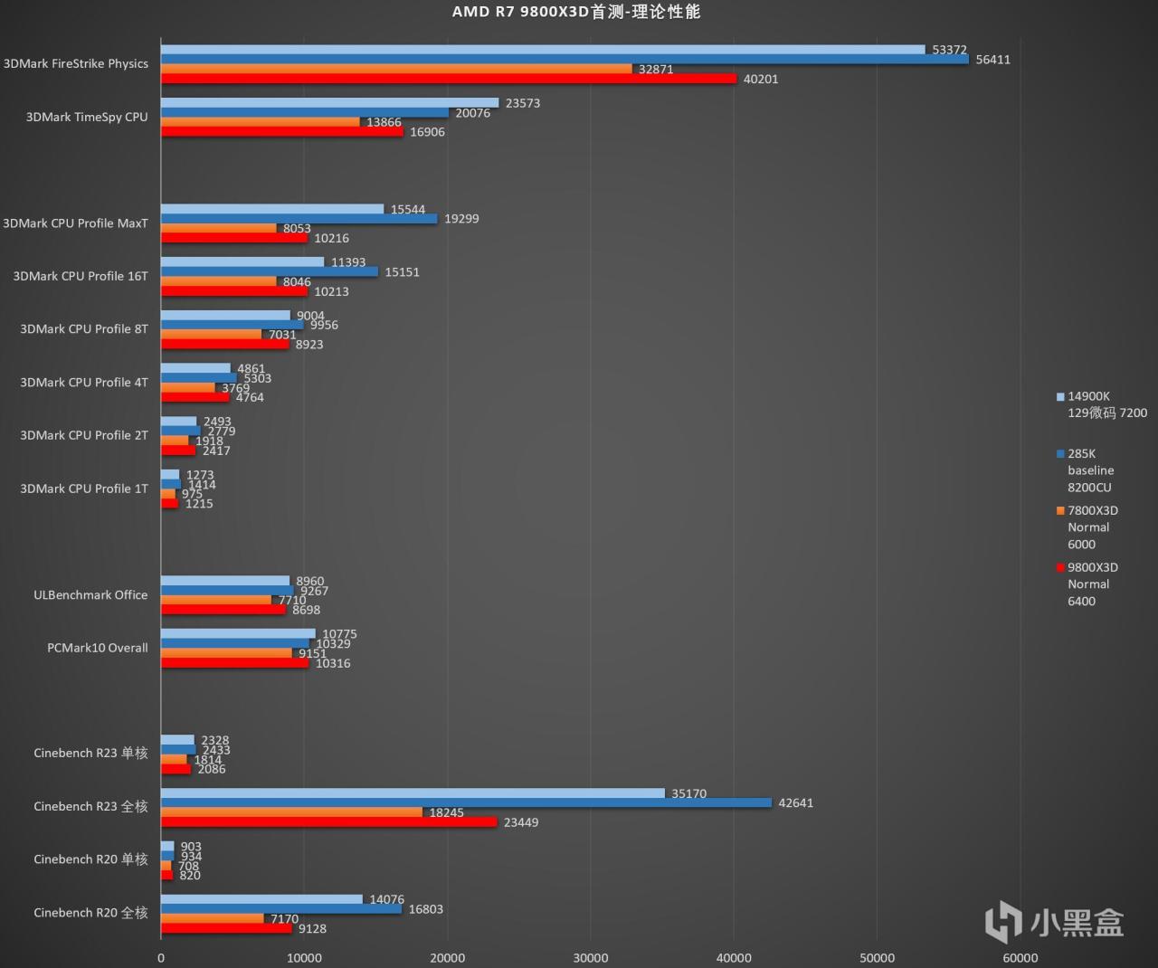 理论性能方面上来就给人很大惊喜:如果说之前7800X3D是“游戏特化CPU”的话,随着9800X3D的理论性能大幅提升,已经成为一个无短板的“水桶CPU”了!例如体现日常应用性能的PCMark和ULBenchmark方面,9800X3D的成绩已经和14900K和285K相差无几了,也就是说日常使用上基本没有什么差别了,毕竟日常应用也很少有能用到超过8核的情况,更何况Intel的超高多核跑分也是靠小核凑出来的,正经干活还是靠那8个P核——现在完全不是9800X3D的对手!和前代7800X3D对比,9800X3D在单核性能上平均提升18.5%,多核性能提升则有23.5%。